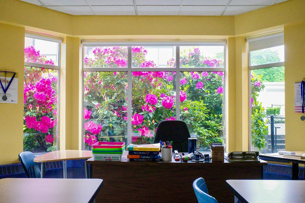 (보너스) 5월 중순의 어느 아침, 창문 밖으로 영산홍이 만개한 신 선생 교실의 모습입니다.