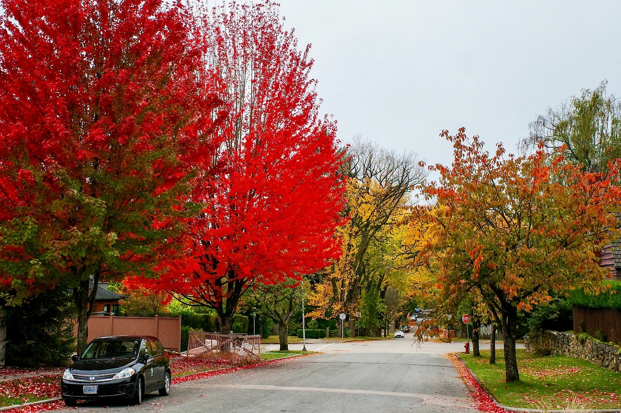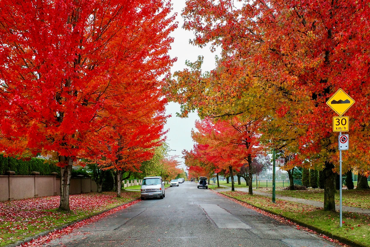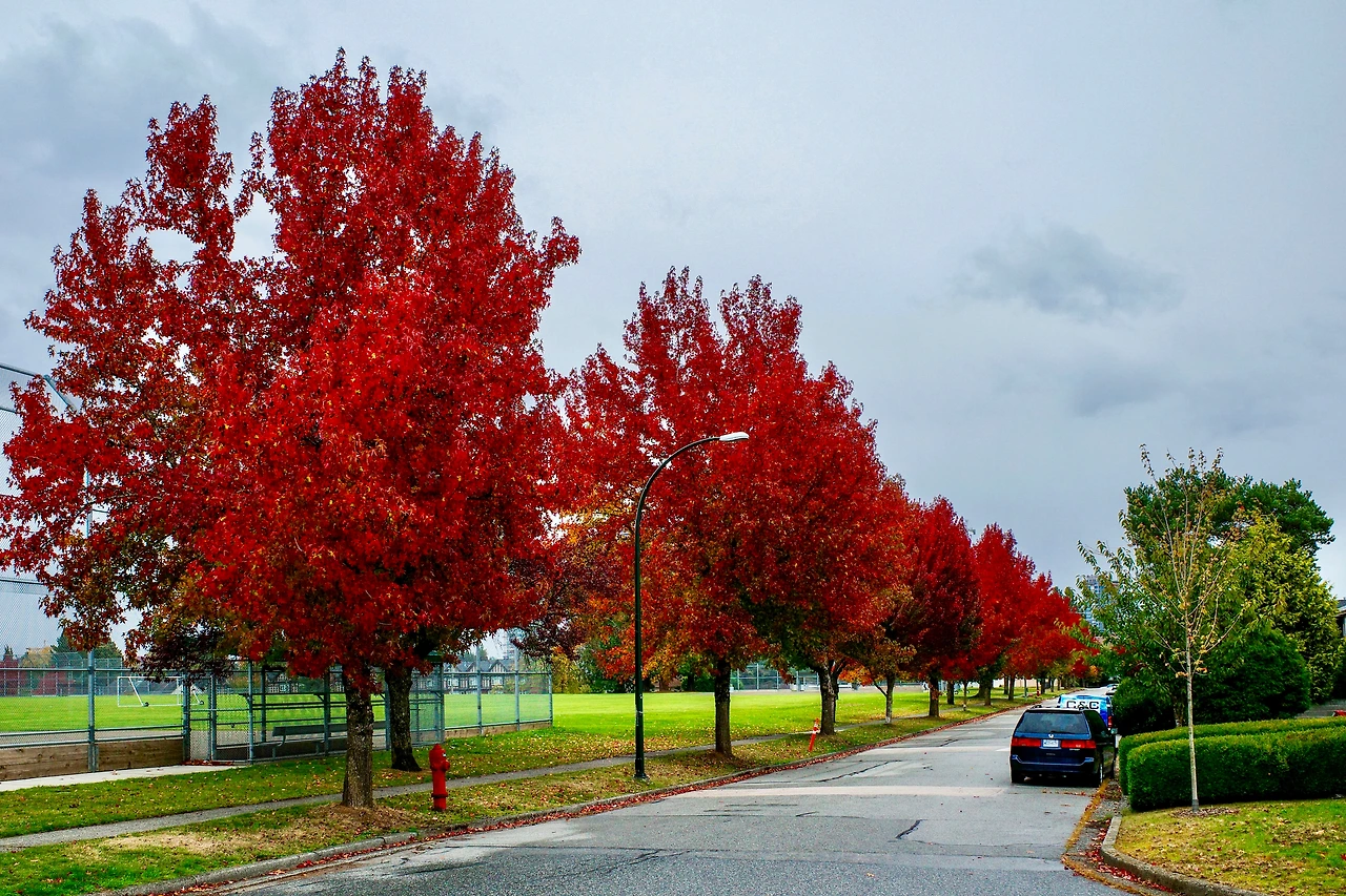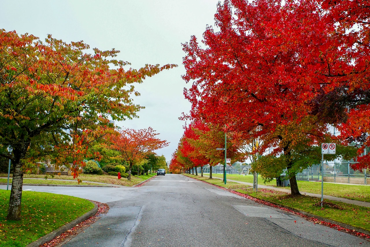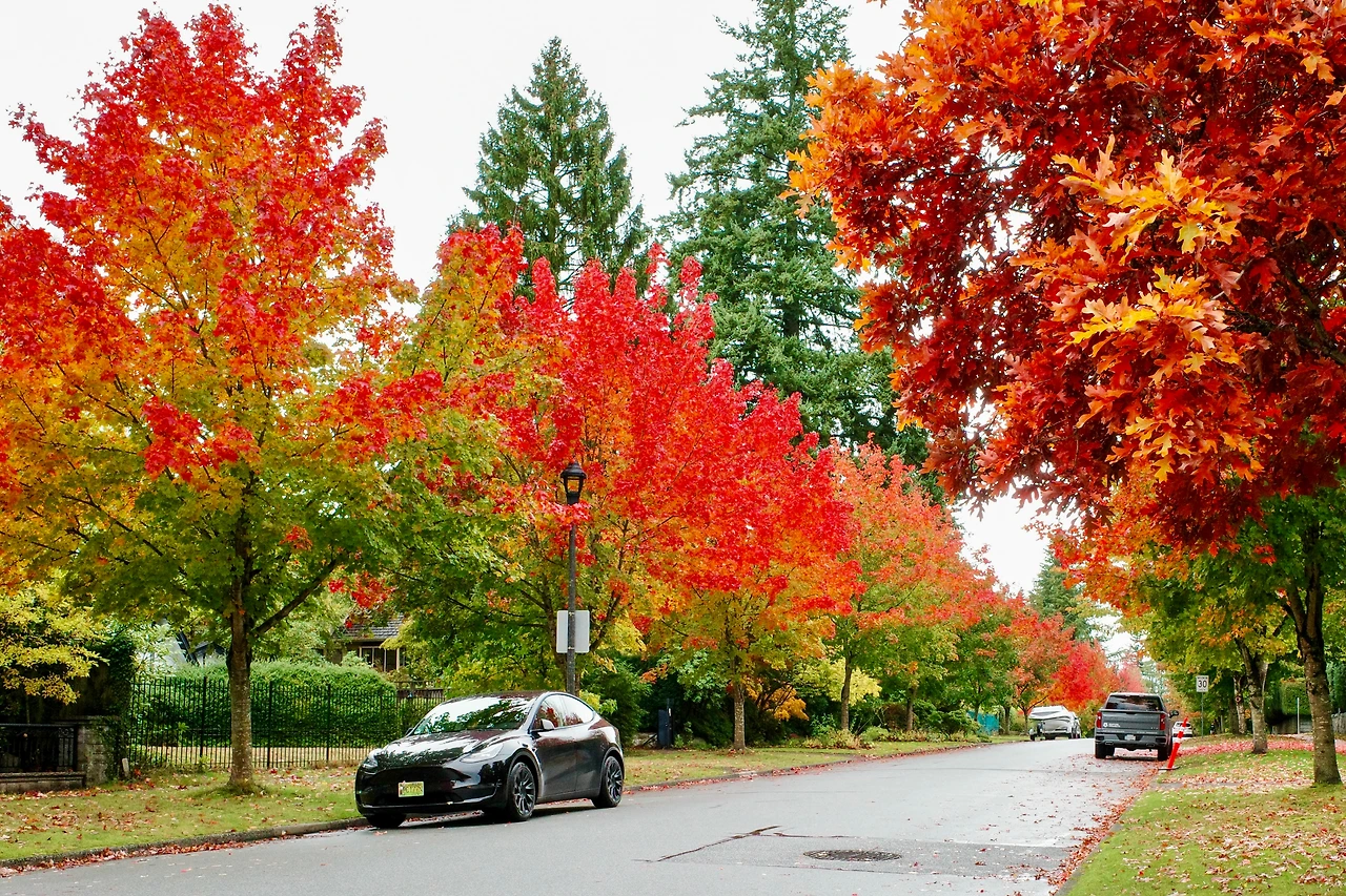 붉게 물든 메이플 나무 아래를 달립니다.