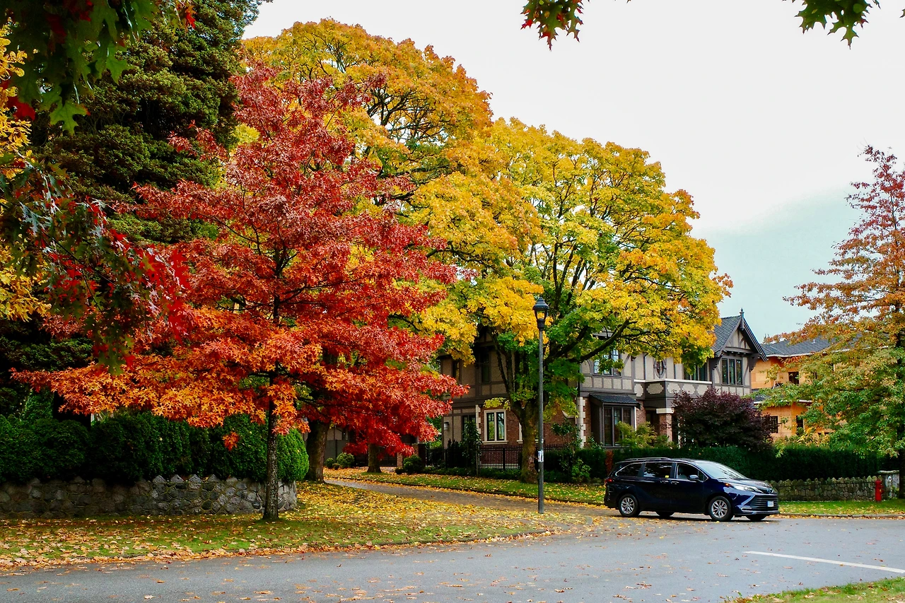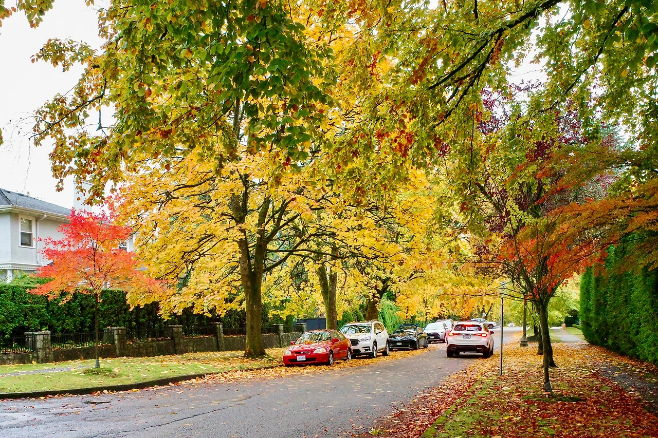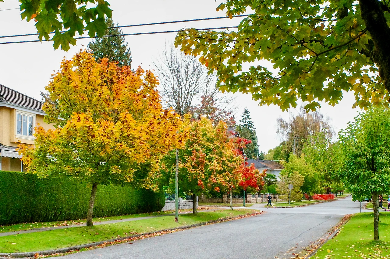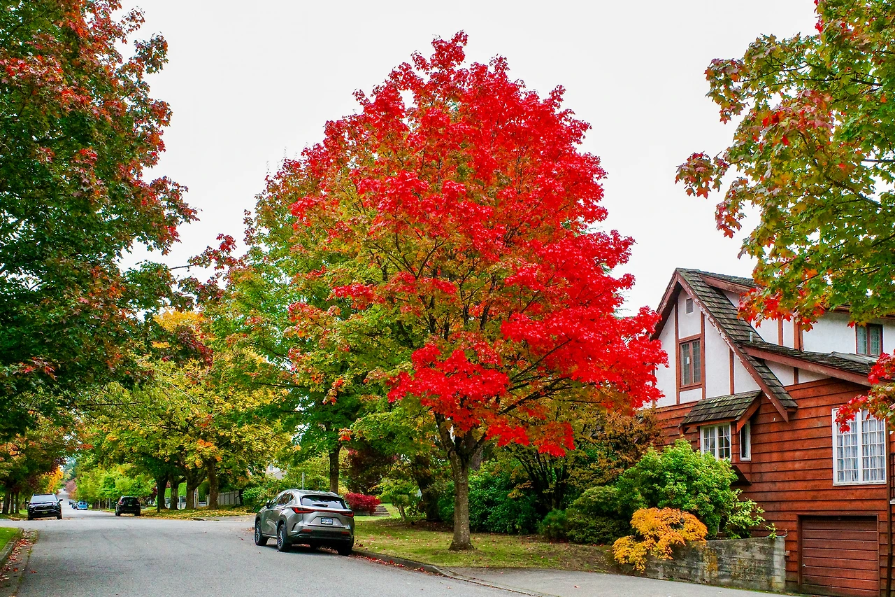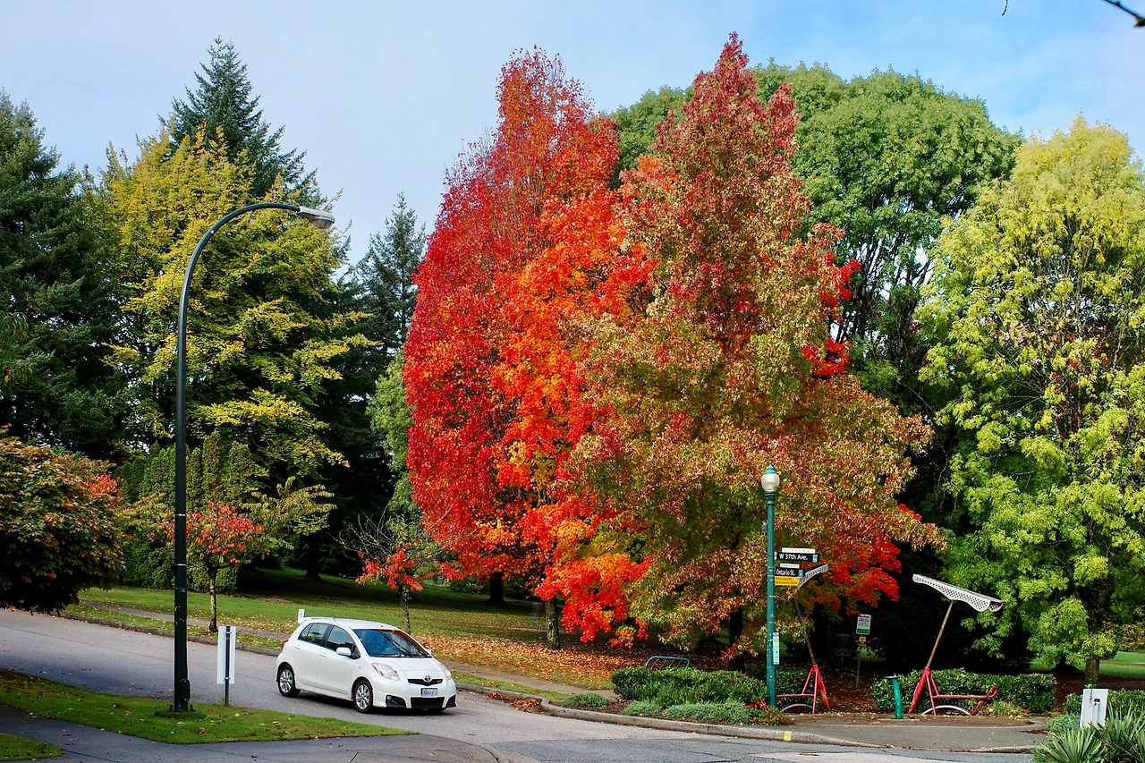 붉게 물든 메이플 나무 아래를 달립니다.