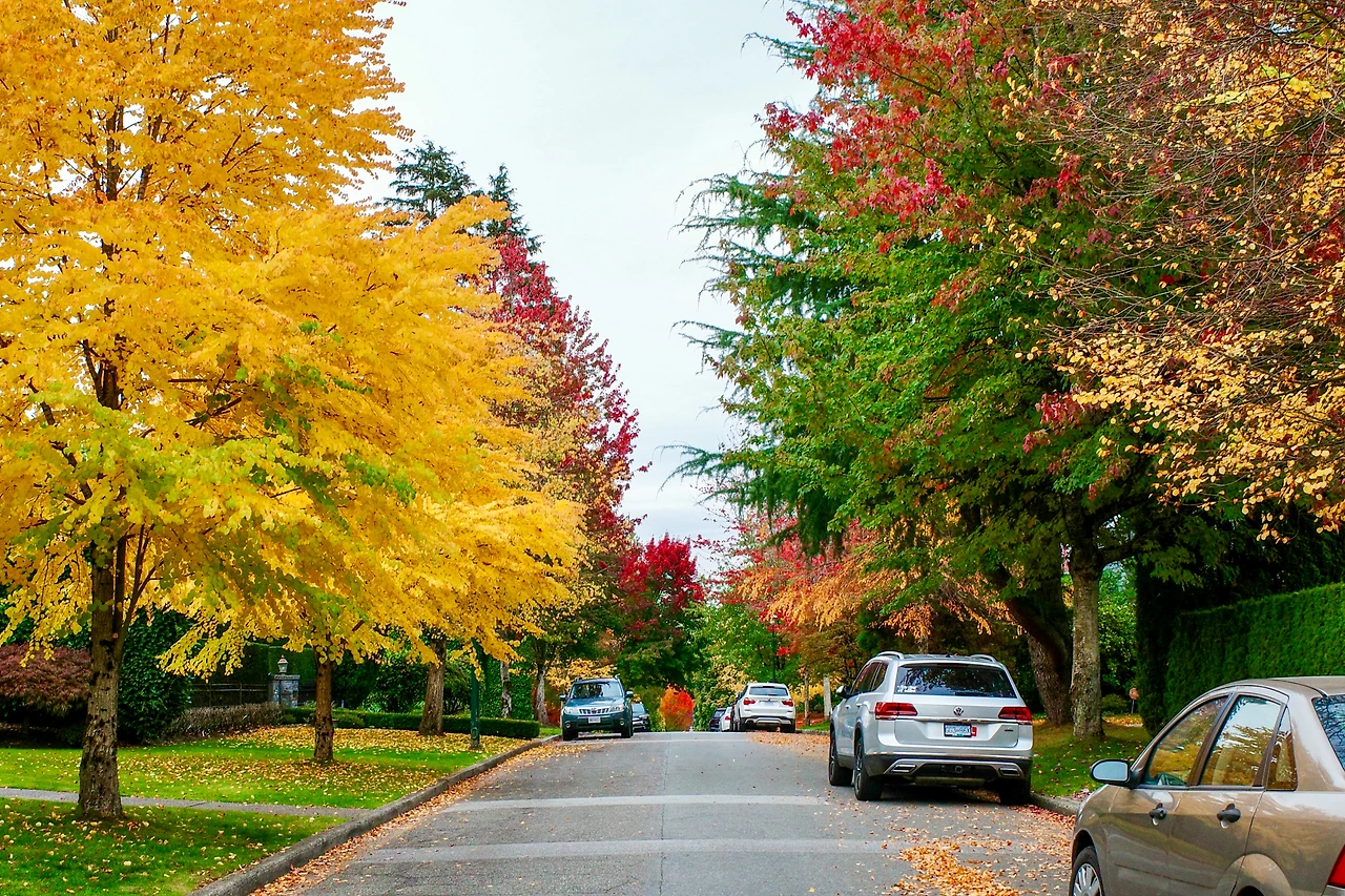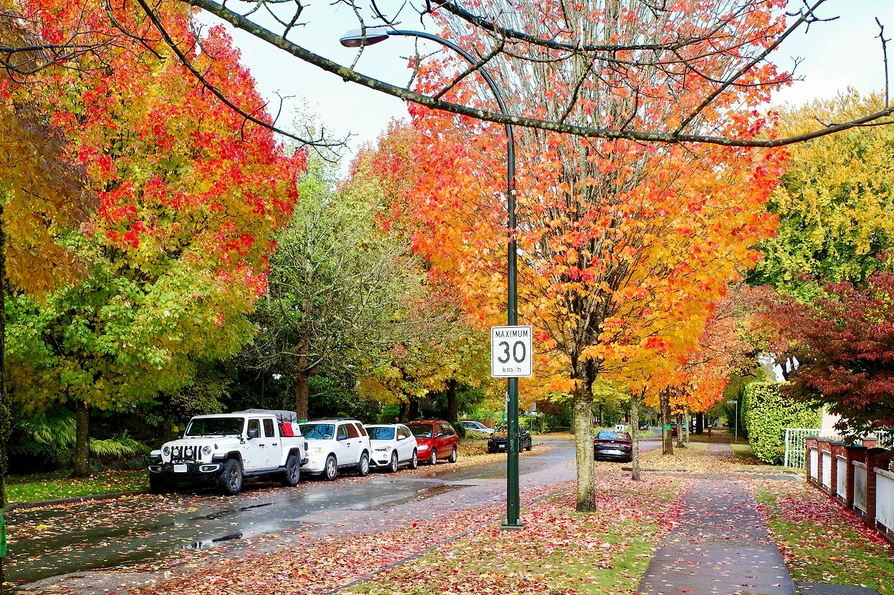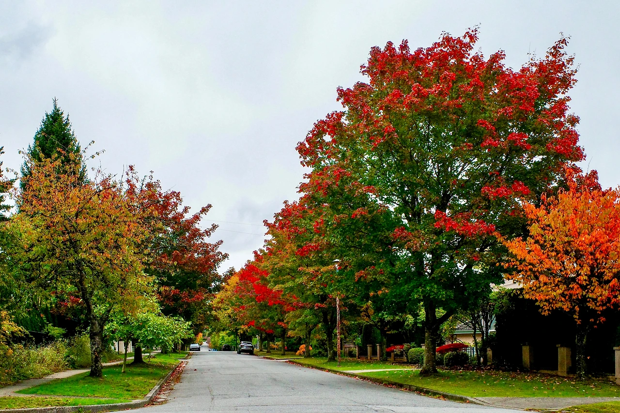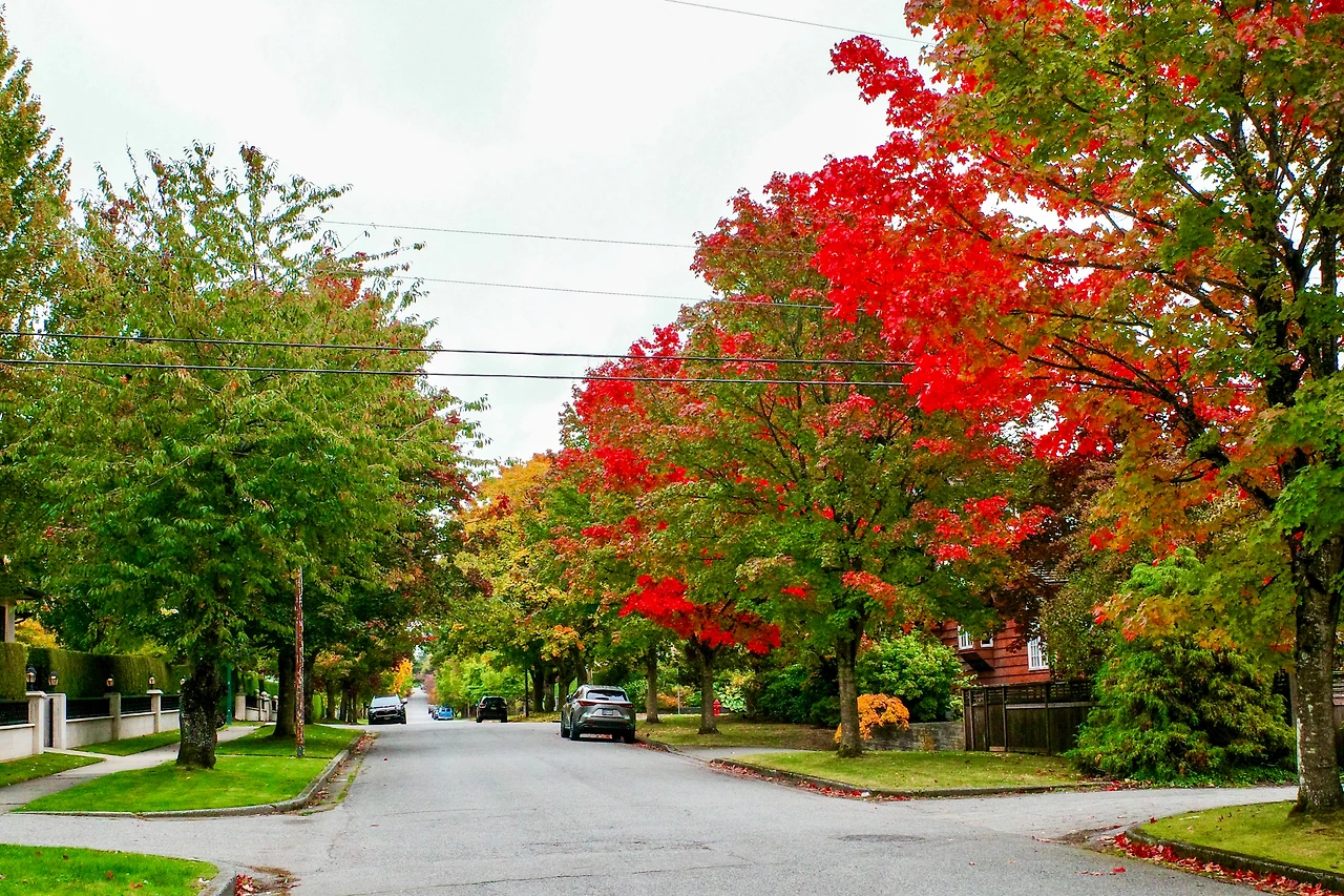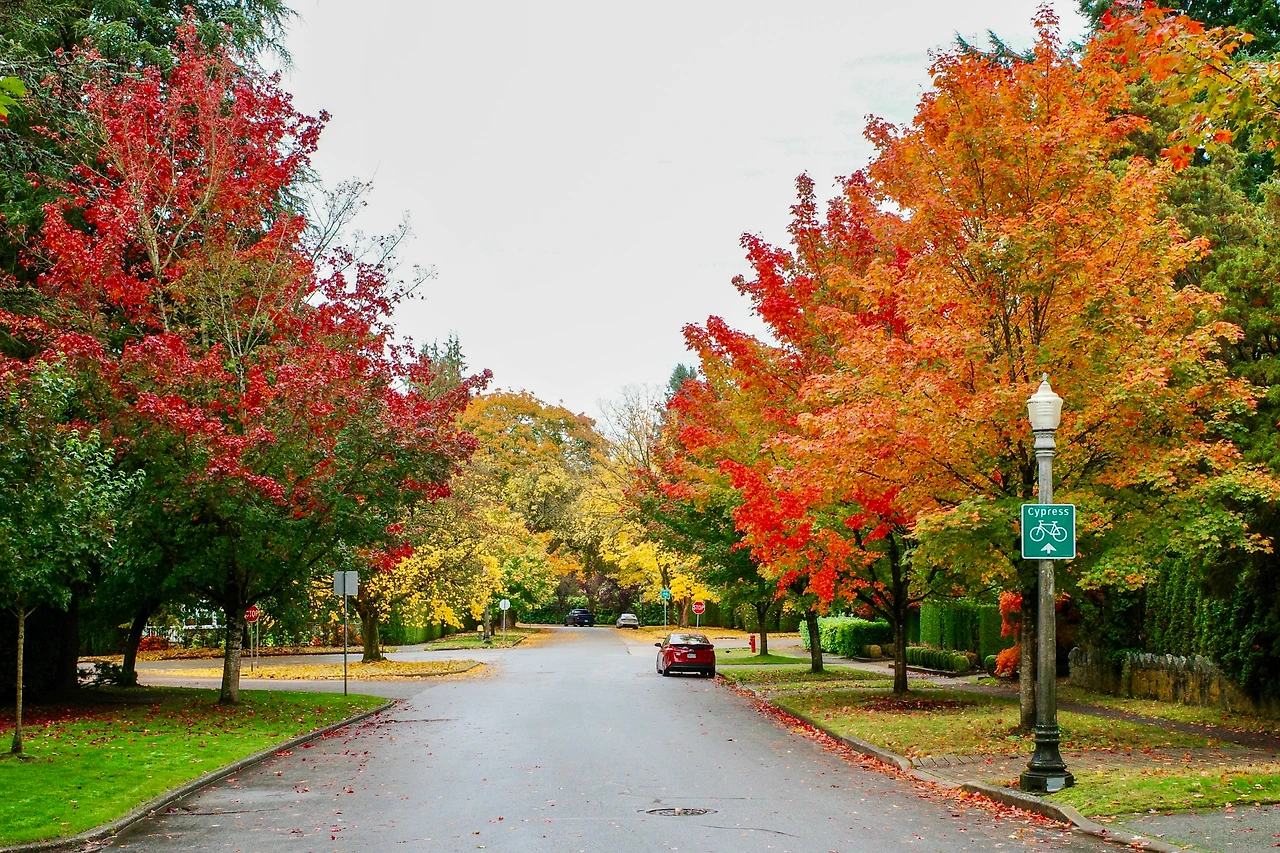 붉게 물든 메이플 나무 아래를 달립니다.