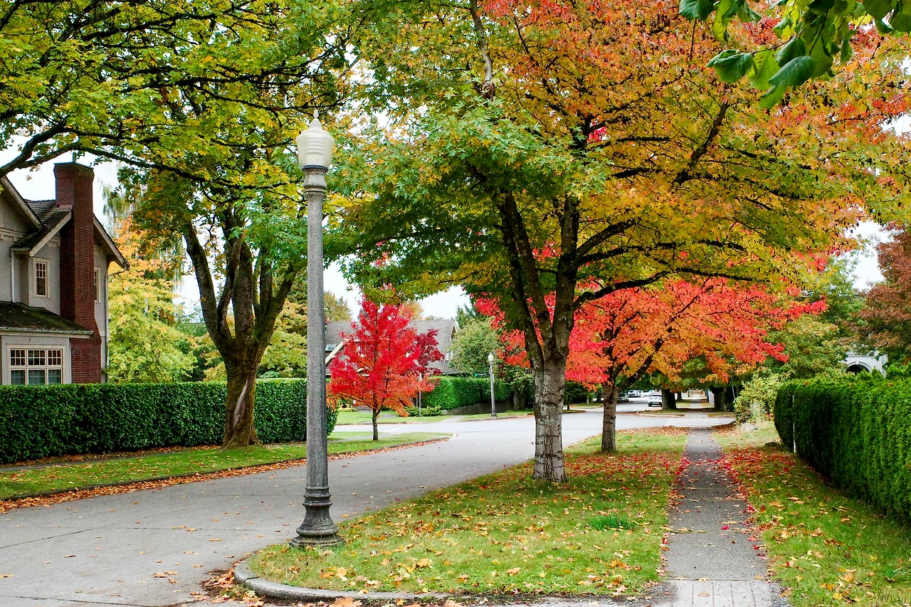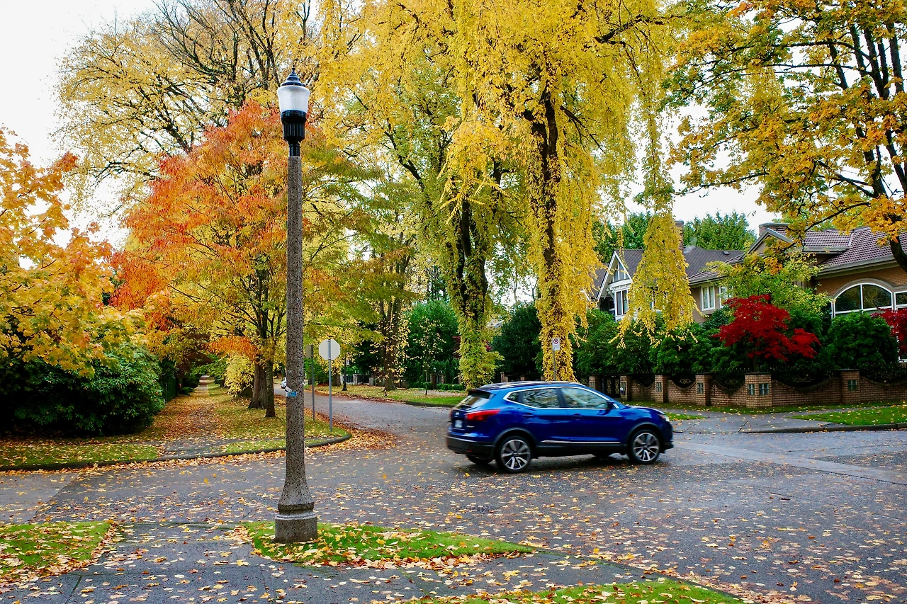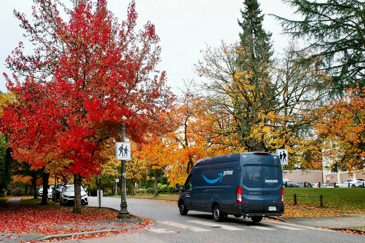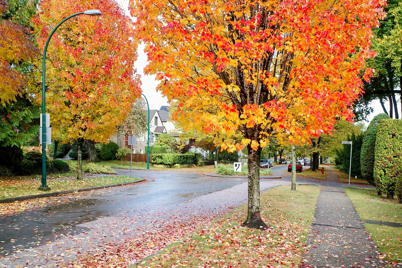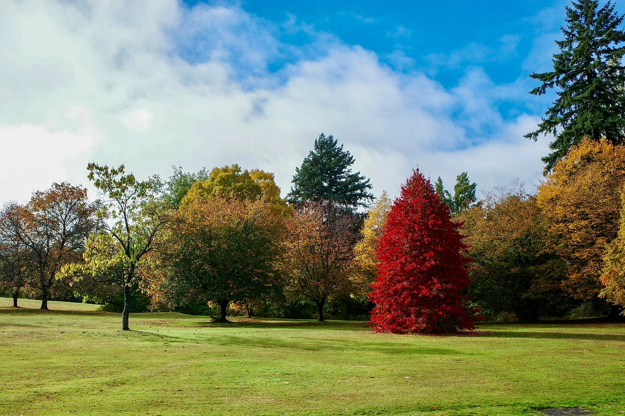붉게 물든 메이플 나무 아래를 달립니다.