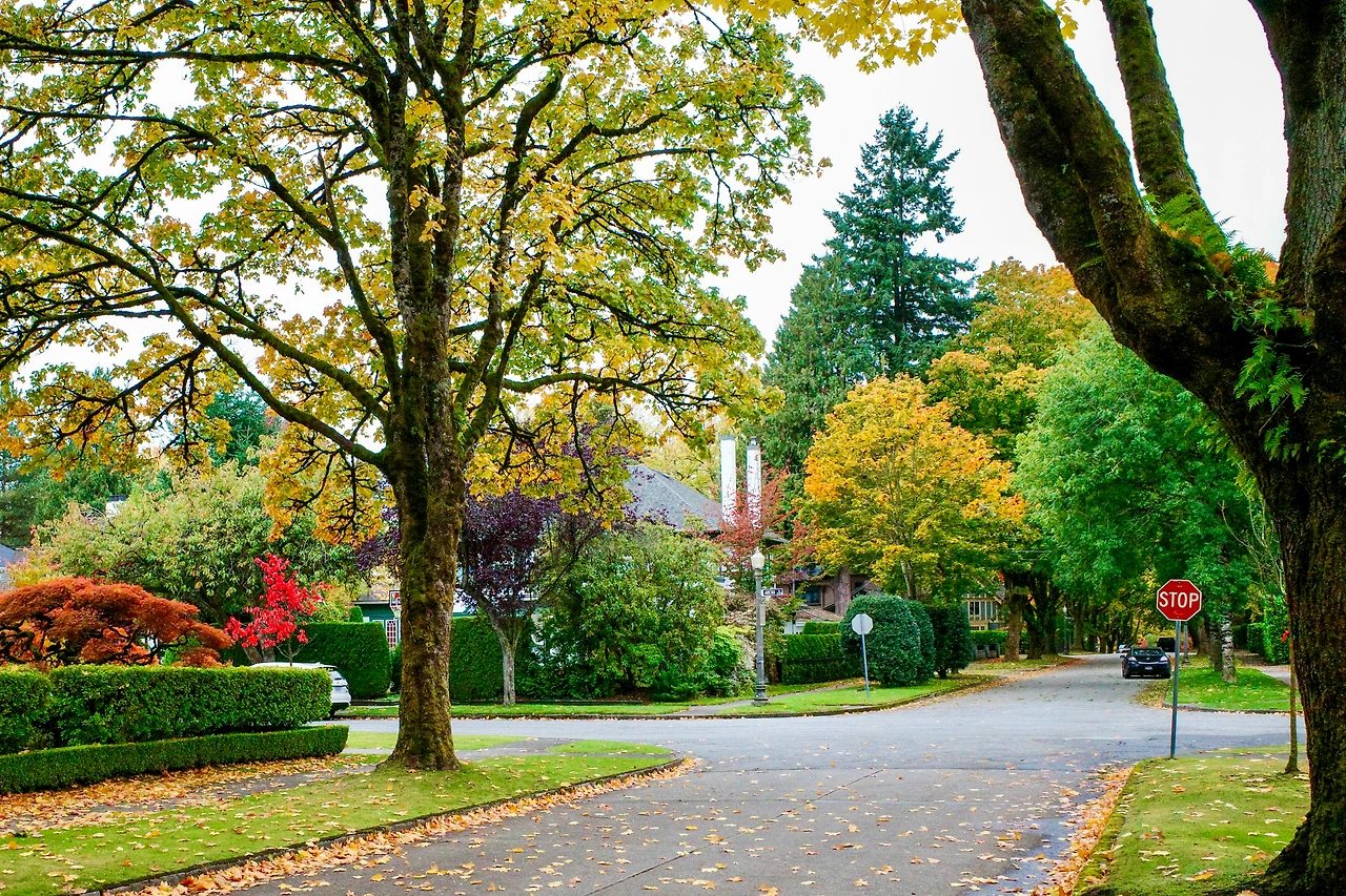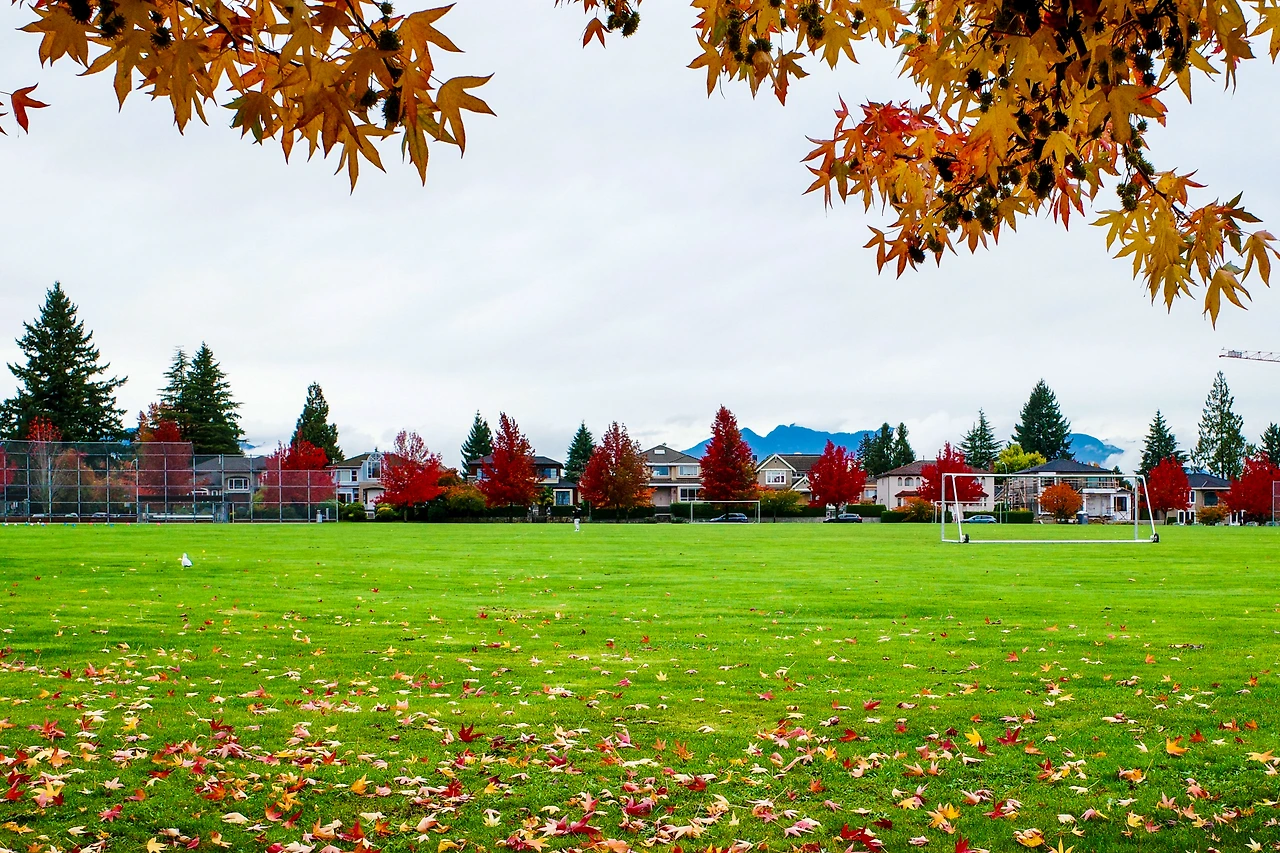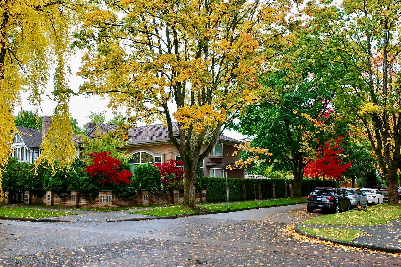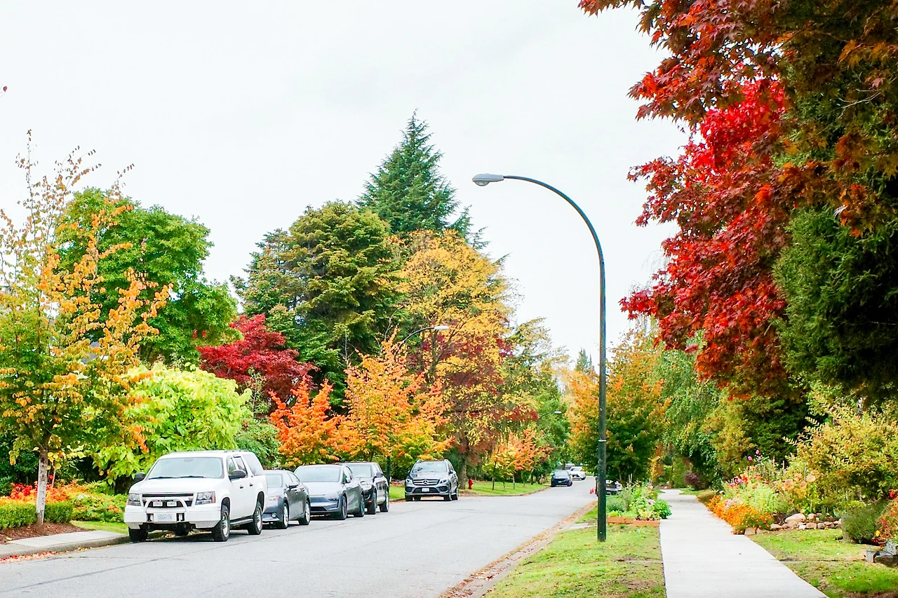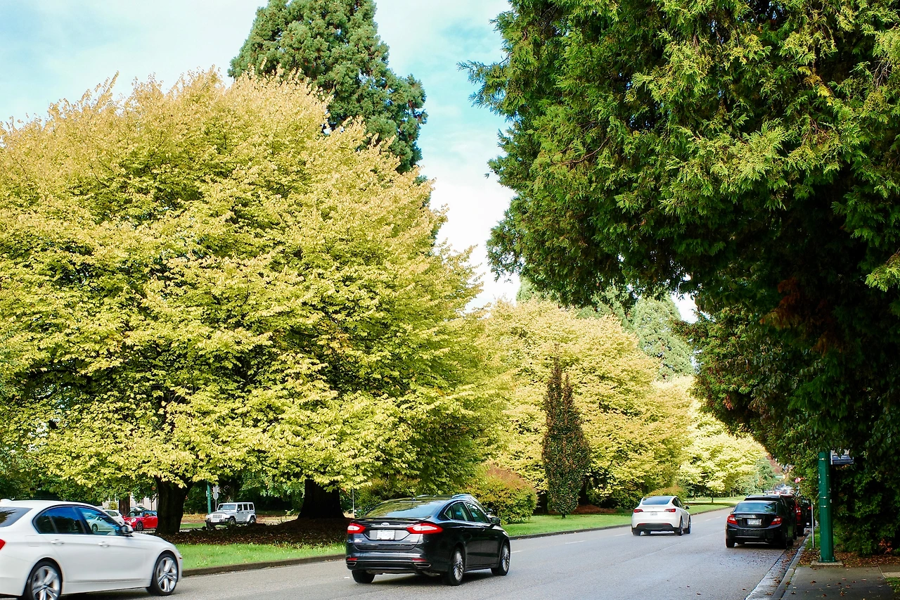 붉게 물든 메이플 나무 아래를 달립니다.