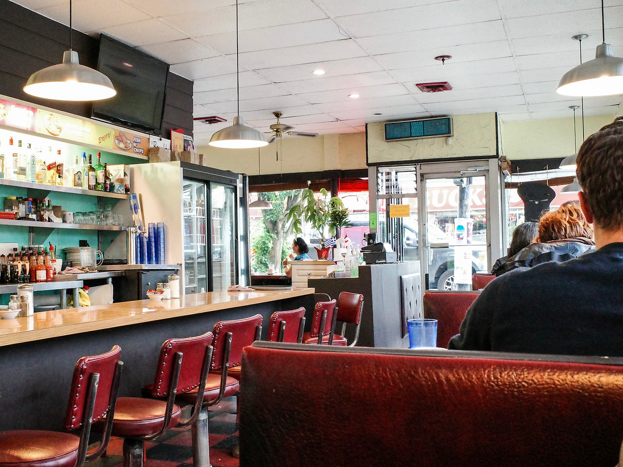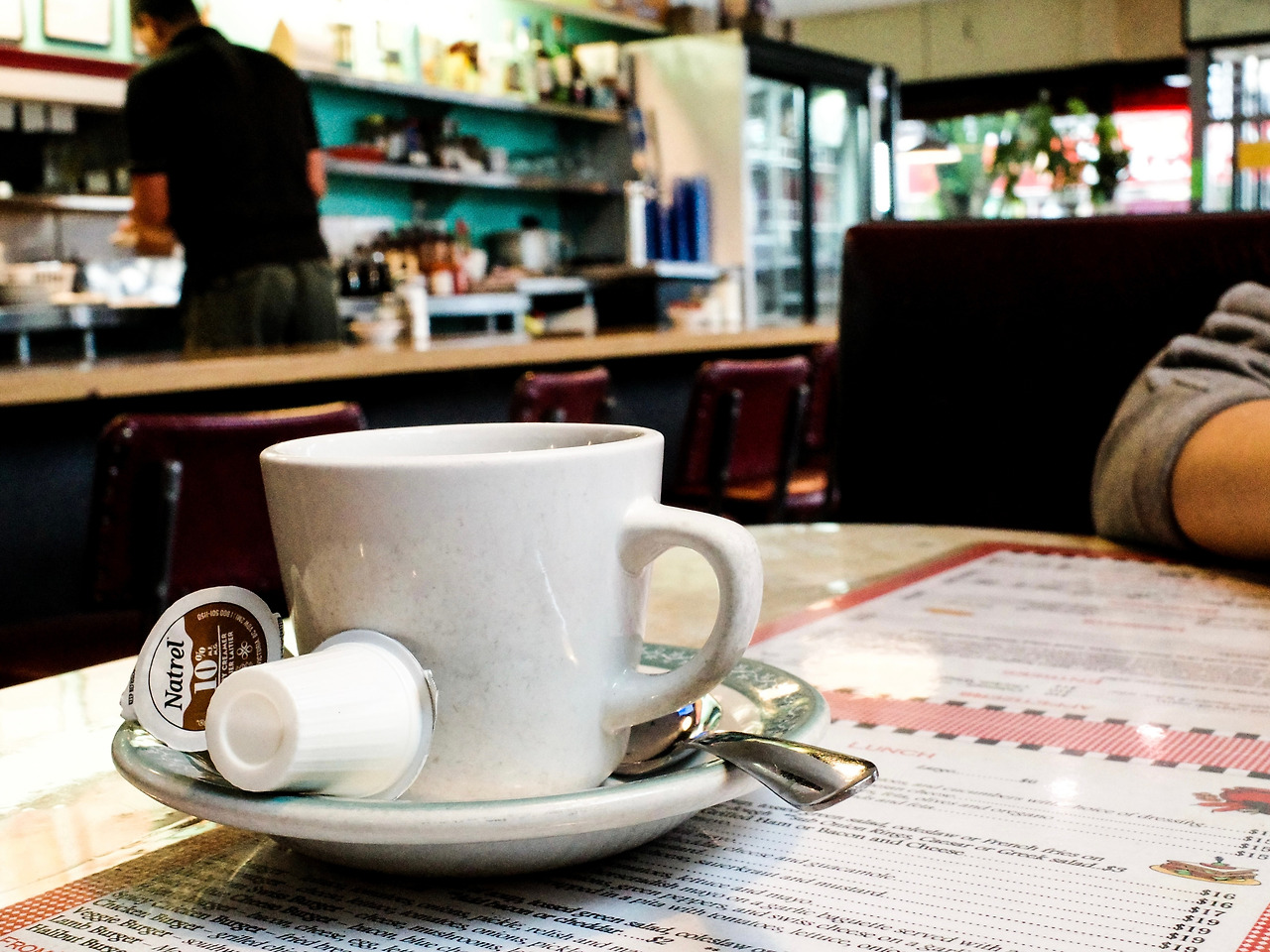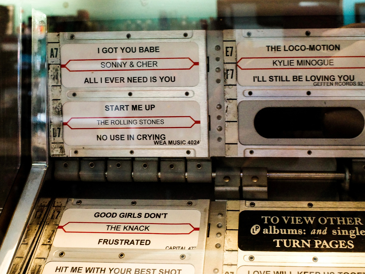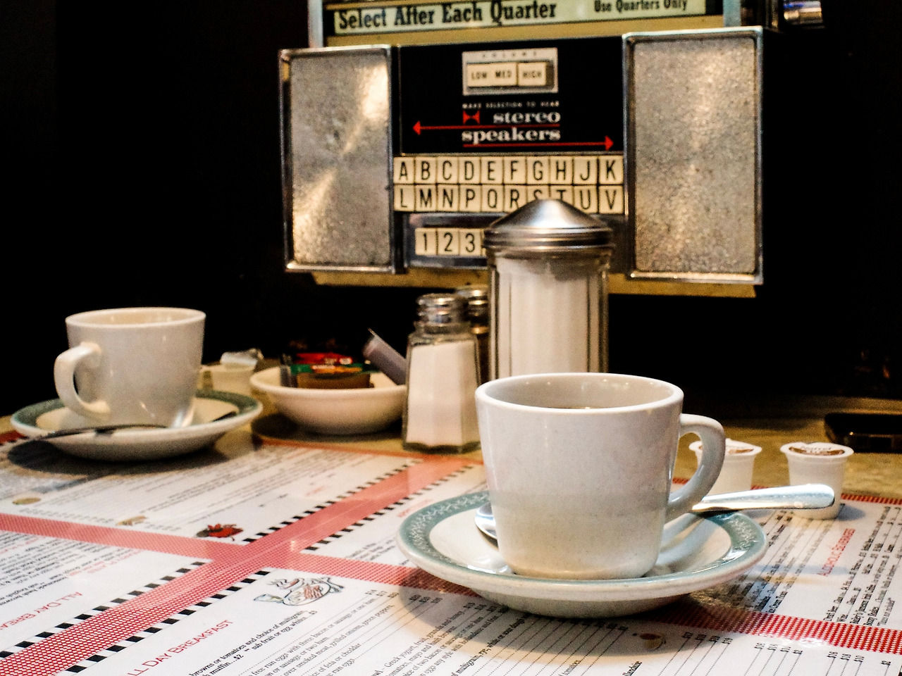 식기 세척기에서 왕그랑댕그랑 최소 5년은 시달렸을 것 같은 빛바래고 스크래치 많은 식기와 머그컵의 느낌이 좋습니다. 커피 무한리필을 사랑합니다. 아직도 이런 코인 주크박스가 있네… 롤링스톤즈의 ‘Start Me Up’과 카일리 미노그의 ‘The Loco-motion’이 눈에 들어옵니다. 한번 틀어볼까? 아, 동전이 없네…