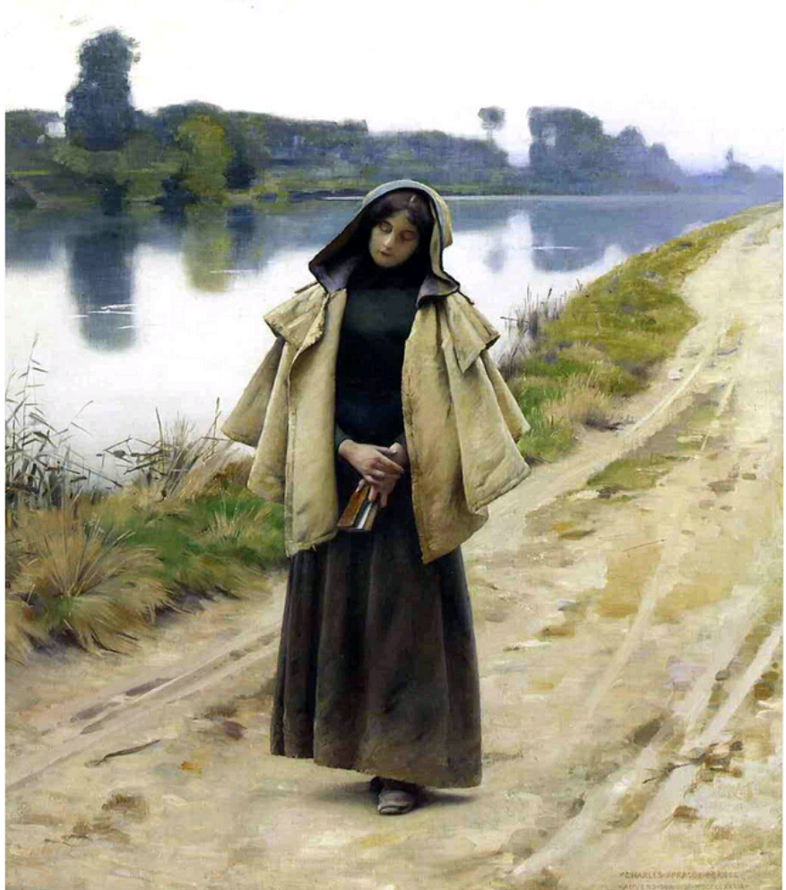 강가를 따라 여인이 눈을 거의 감은 듯 내려 깔고 걷고 있다. 손에 책을 들고 있는 것으로 보아 저 뒷길 풀섶 어느께에 앉아서 책을 읽다가 자리를 떨고 일어난 듯하다. 책갈피를 대신한 손가락이 읽다 만 곳에 걸려 있다. 도저히 내쳐 읽을 수 없었던 모양이다.