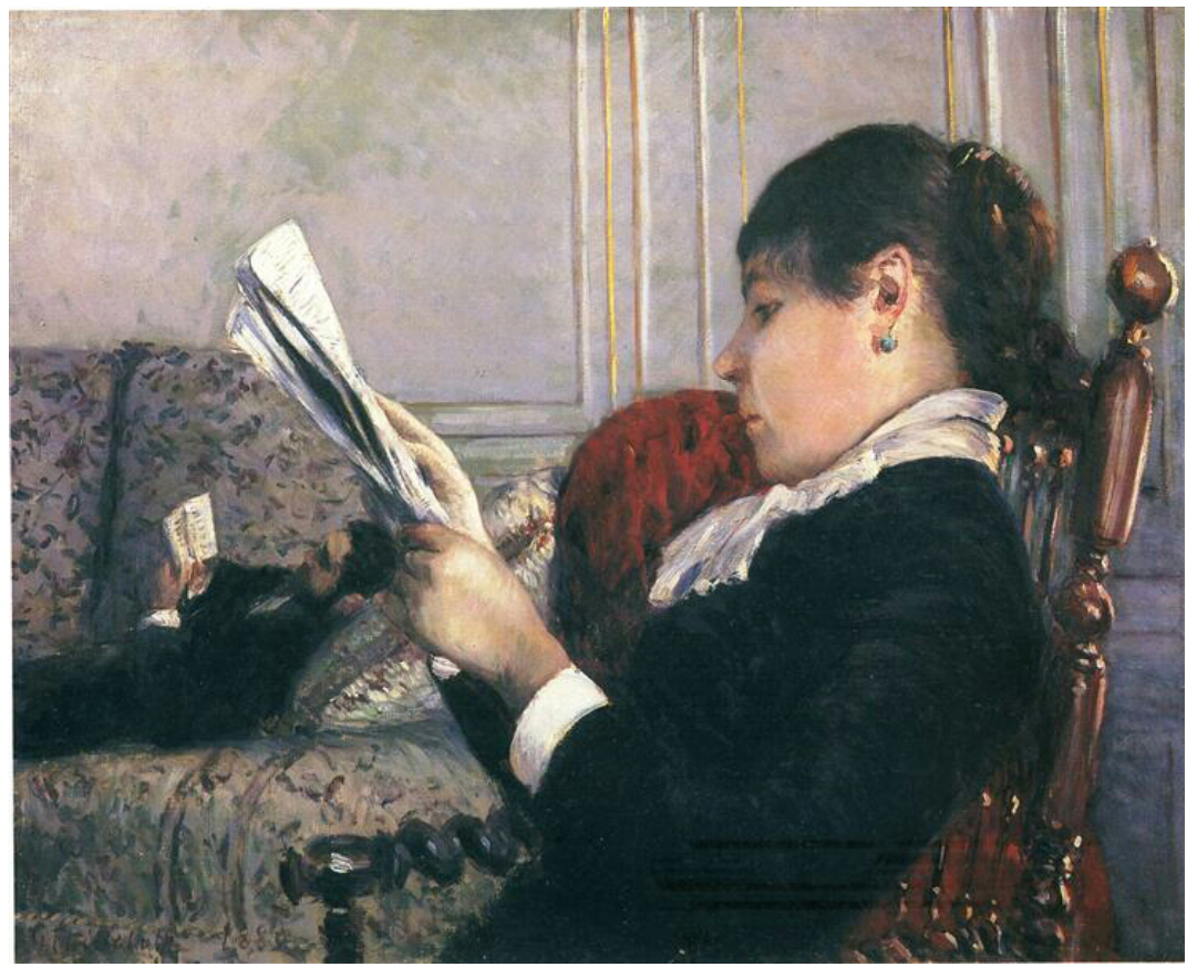 반면 뒤에 놓인 소파 위에서는 남편이 누워서 책을 읽고 있다. 단란한 가정의 일상처럼 보인다.