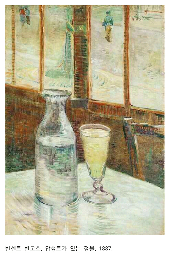 압생트는 인상주의 화가들 사이에서도 당연히 사랑을 받았다. 특히 로트렉이나 고흐 같은 애주가들의 경우에는 더욱 그러하였다. 이들은 압생트를 제목으로 하는 그림들을 많이 그렸다. 고흐의 <압생트가 있는 정물>은 1887년 파리에 체류하던 시절에 그린 것으로 비교적 담백하다. 압생트의 도수가 세서 스트레이트로 먹기가 부담스러운 사람은 물에 희석해 먹기도 하므로 이처럼 물병이 함께 그려져 있다. 창문 밖으로 행인들이 자그맣게 보이는데, 앞서 가는 연인들 뒤로 홀로 걷는 행인의 고독한 뒷모습에 평생을 홀로 외로이 살다간 화가의 모습이 투영된다.