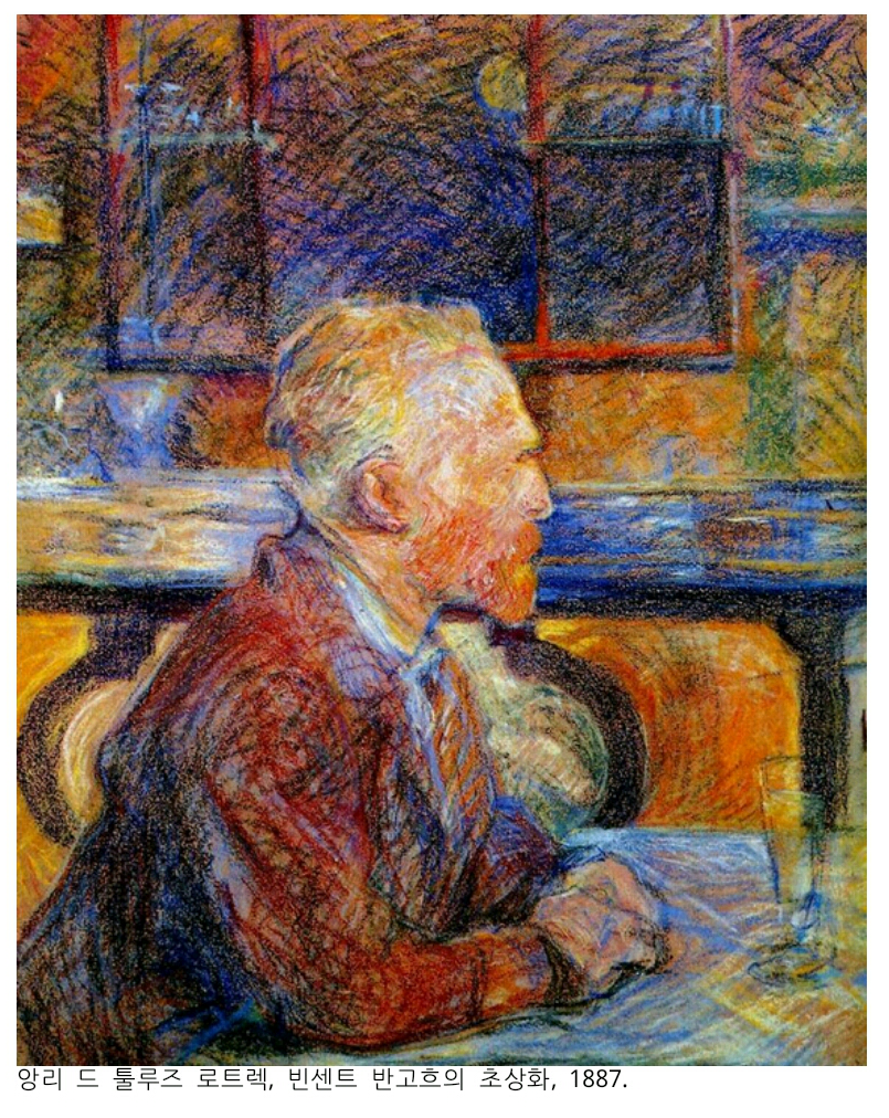 이를 포착한 그림이 있으니 바로 툴루즈 로트렉이 그린 <빈센트 반고흐의 초상화>이다. 카페에 앉아서 홀로 압생트를 마시는 고흐의 모습을 파스텔화로 그린 것이다. 압생트를 그리거나 마시며 고흐가 눈 앞에 보고 싶었던 것은 무엇이었을까