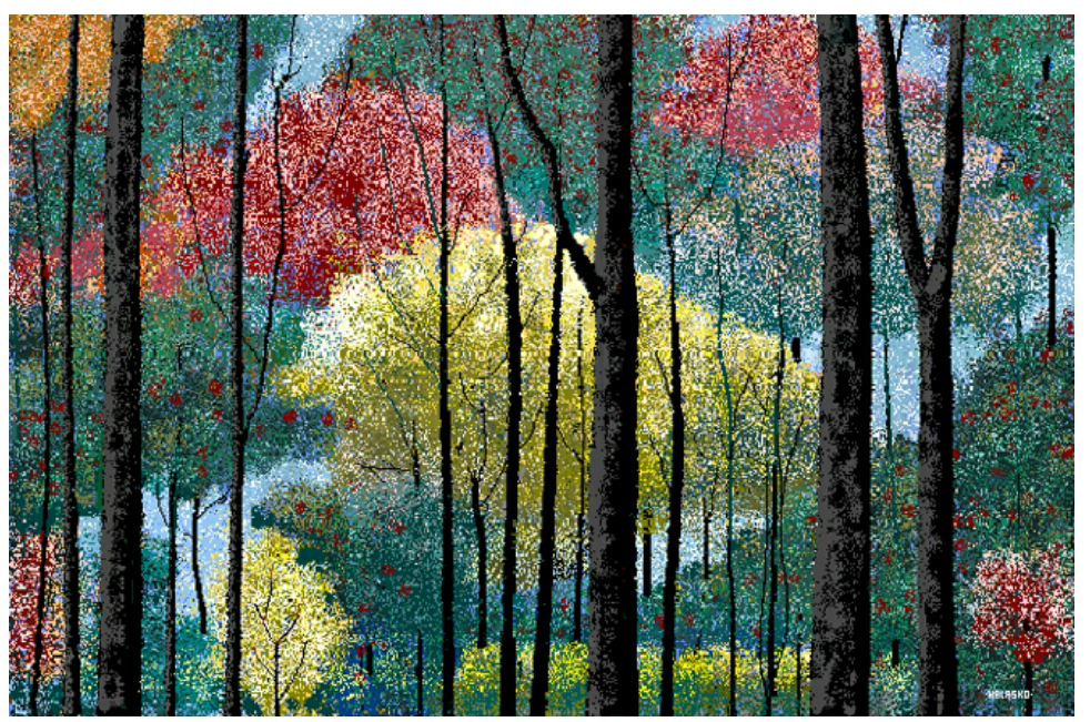 이 그림의 화가가 바로 그렇다. 할 라스코(Hal Lasco)는 미국의 초고령 픽셀 화가이다. 무려 98세이다. 그는 십 수 년전 황반변성으로 인해 시력이 악화되었으나, 손자의 도움으로 MS사의 그림판 소프트웨어를 익혀서 지금은 디지털 그림 작업을 하고 있다. 수 십배 확대가 가능하여 나쁜 시력으로도 확대된 픽셀 하나하나에 색을 입혀 그림을 완성한다. 따라서 엄청된 시간을 필요로 하는데 그에게 남아도는 것도 시간이어서 끈기있게 작업을 수행한다. 그린 작품으로 전시회도 가지고, 지금은 온라인 판매도 한다. 여가생활의 기쁨에 이어 수입원도 되는 셈이다.