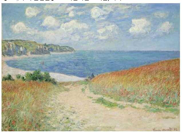 다른 한편으로는 계통발생을 되풀이하는 개체발생의 무의식적 기억 속에서 심원의 고향인 바다에 무조건적으로 끌리는 것인지도 모른다. 그런 연유로 어린 아이건 어른이건 할 것 없이 바다를 대면하게 되면 다들 ‘와, 바다다’하며 환호성을 내지르게 된다. 클로드 모네의 <푸르빌의 밀밭 길>을 보면, 절로 그런 탄성이 나오지 않을까 싶다.