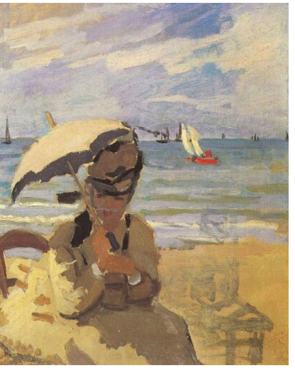 1870년에 그리기 시작해 이듬해 완성한 <트루빌 해변에 앉아있는 카미유>에서 모네는 아내 카미유를 그렸다. 대담하고 자신만만하게 한 필치로 그린 화면에서, 그녀는 양산을 들고 수줍은 얼굴로 살짝 고개를 돌리고 바닷가 의자에 앉아 있다. 그녀도 신혼의 행복으로 그늘 속에서 미소를 머금고 있다.