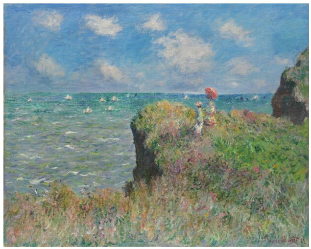 푸르빌의 절벽을 한가로이 거닐고 있는 두 젊은 여인은 아마도 알리스의 딸들인 마르타와 블랑쉬인 듯하다. 모네는 통일성을 해치지 않으면서 풍경 속에 형상을 집어넣는 문제를 질감과 색조를 통해서 해결하였다. 기운차게 구부러진 짧은 붓놀림을 통해 절벽 위 들풀들은 산들바람에 이리저리 흔들리고 있고, 비슷한 방식으로 여인들의 드레스와 숄도 바람에 흩날리고 있다. 저 멀리 바다 물결이 일렁이고 있는 모습도 생생하게 그려져 있다. 전경 들풀의 초록 색감도 자연스럽게 절벽 아래 바다 색으로 이어져 내려 가고, 저 먼 바다에 이르러서야 짙은 청색과 배합되고 있다. 바다 색은 다시 수평선 위 파란 하늘로 이어져 올라 간다.