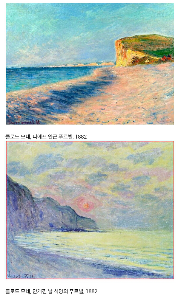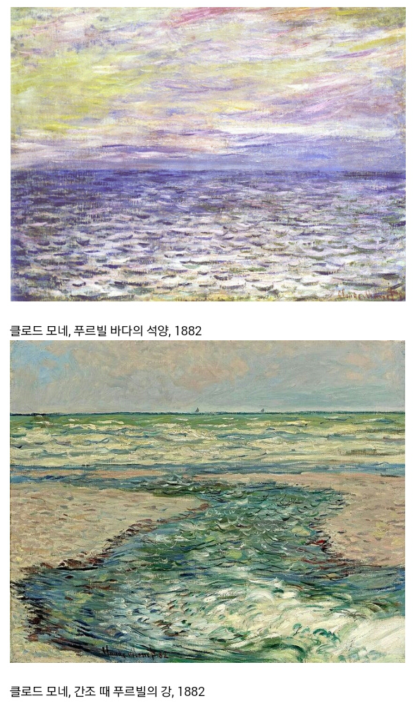 모네를 일컬어 흔히 물의 화가라고 한다. 수련 연작을 통해서도 이 명명의 논거가 더욱 입증되지만, 그에 앞서 일련의 바다 연작을 통해서도 이미 그 이름에 걸맞는 작품들을 보여 주었다. 그에게 바다는 고향이자 그리움이며, 말년에 병들고 지쳤을 때에도 힘을 주는 어머니 품같은 위안이었다.