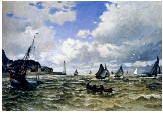 늘 바다를 보고 자라서인지 모네의 초기 그림 중에는 유독 바다 그림이 많다. 1865년 모네가 25살 때 처음 살롱전에 입선하게 되는 데, 그때 그림 2점이 모두 바다 풍경을 그린 것이다. 그 중 하나가 <옹플뢰르의 센강 입구>이다.