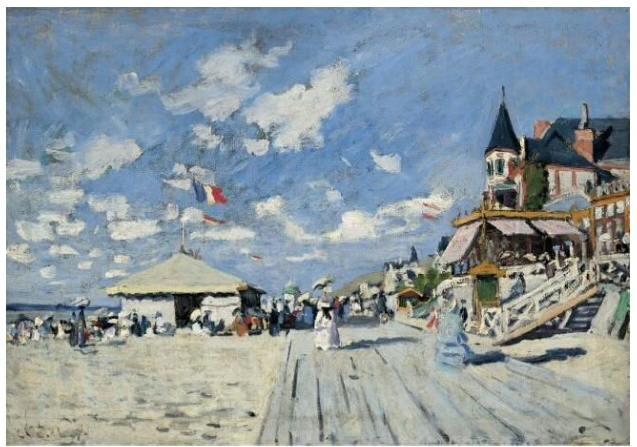 <트루빌의 판잣길>은 그곳 해안 정경을 잘 묘사하고 있다. 삼색기가 펄럭이는 바다 바람 속에서 구름이 속도감 있게 지나는 여름 하늘은 강렬한 햇빛을 내리쪼이고 있어 주변을 온통 탈색시키고 있다. 모래밭이며 판잣길, 건물 벽이며 차양, 사람들의 옷은 물론이고 심지어 그림자까지도. 신혼의 들뜬 기분이 풍경을 더 환하게 만들었는지도 모르겠다.