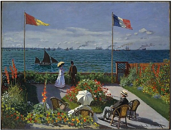 <생타드레스의 테라스>도 이때 완성한 작품이다. 환상적인 바다 전망이 보이는 이 곳은 모네의 고모 집 윗층 테라스이다. 앉아서 전망을 즐기는 두 사람은 아버지인 아돌프 모네와 고모 소피 르가르드이고, 그들 앞쪽에 서 있는 사람은 화가의 사촌인 잔 마그리트 르가르드와 이 가족의 친구이다.