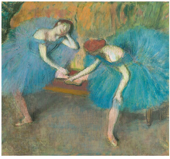 드가는 말년에 거의 시력을 잃어갔다. 그럼에도 그는 자신이 좋아했던 발레리나 그림을 계속 그렸다. 1910년경의 <휴식을 취하는 두 발레리나>의 경우가 그즈음 그린 작품중 하나이다. 드로잉과 인물이 분리된 듯한 것이 마치 마음속의 환영을 그려 놓은 것처럼 색조까지도 비현실적으로 몽환적인 느낌을 준다. 발레리나는 근 40년 가까이 드가가 즐겨 그려온 소재였다. 누가 뭐래도 그는 역시 발레리나의 화가일 수밖에 없다.