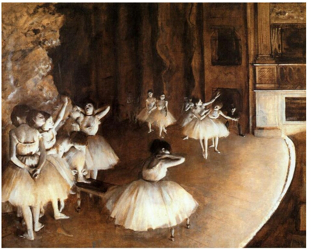 <무대에서의 발레 리허설>은 무대 위에서 무대를 아래로 내려다 보며 조망하는 시점으로 그려져 있다. 실연을 하거나 자기 차례를 기다리며 준비 또는 연습을 하고 있는 발레리나의 다양한 모습을 담고 있다. 이들의 하얀 발레복이 무대 뒤의 어둠과 대비되어 더욱 두드러지게 보인다. 한편으로 명암으로만 드러나는 발레리나들의 얼굴은 감정없이 무표정하게 그려지고 있으며, 때로 창백한 얼굴이 괴기스럽기까지 하다. 오른쪽 무대 끝에 조그맣게 그리져 있어 유심히 보아야만 알 수 있는 나이든 신사가 모자를 쓰고 의자에 앉아 있는데, 조금은 생뚱맞다.