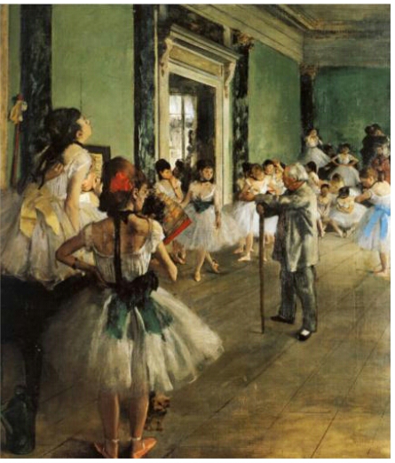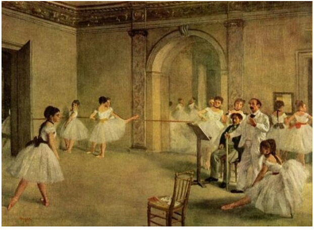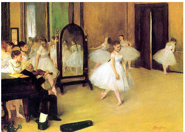 이후 발레리나들을 본격적인 소재로 한 초기작이 나오는데 그중 하나가 1870년경에 그린 <무용수업>이다. 왼쪽에 인물이 모여 있어 무게중심을 쏠리고 있지만, 오른쪽의 빈 공간이 이를 받아내고 있는 것은 교습중인 발레리나가 앞으로 내딛는 움직임의 힘 때문이다. 그림에 거울을 등장시켜 공간을 확장시키거나 다양한 시점에서 인물들을 관찰할 수 있는 기회를 주고 있다. 이러한 방식은 수업 받는 모습을 그린 다른 발레리나 그림에서도 동일하게 반복된다. 이제 막 시험이 끝나고 무용선생님이 몇 가지 조언을 해 주고 있는 순간을 그린<오페라극장의 대기실> 에서도 거울이 공간을 확장시켜 준다.