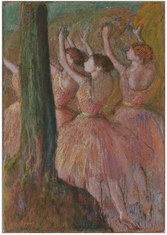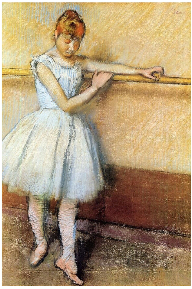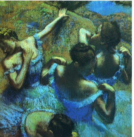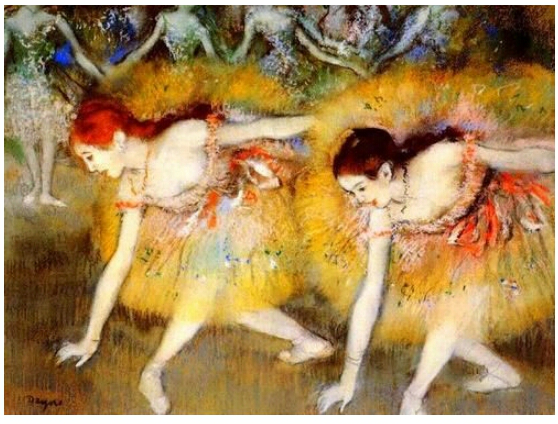 보들레르는 ‘춤은 팔과 다리로 쓰는 시’라고 말했다. 춤은 움직임을 통해서 아름답게 꾸민 전율을 느끼게 만드는 우아함 그 자체이다. 드가의 발레 그림중 특히 파스텔 그림은 바로 이를 확인시켜 준다. 여기에서 발레리나의 얼굴은 그리 중요하지 않다. 초상화가 아닌 까닭에 많은 경우에 발레리나의 얼굴은 대부분 흐릿하거나 음영으로 그늘진 윤곽으로만 그려진다. 그에게는 춤이라는 시의 인상이 중요할 뿐이다.