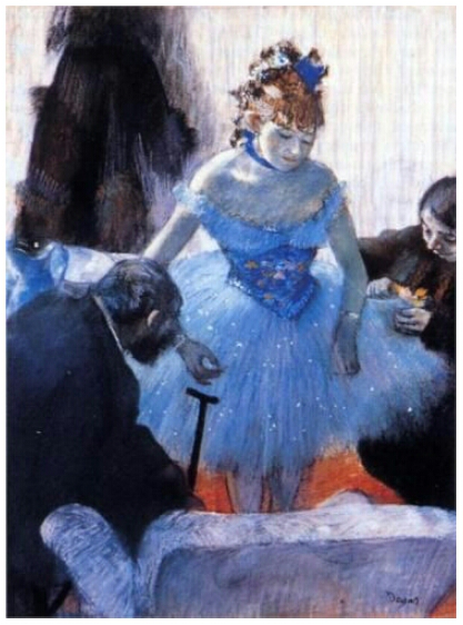 <푸른 옷의 댄서>, <막간의 분홍 옷 댄서>는 무대에서 공연을 준비하거나 연습하는 모습이고, <허리를 구부린 댄서>는 공연중인 모습이다. 파스텔로 그린 댄서들의 의상 색깔들이 각각 파란 색과 분홍색, 노란색으로 통일된 색조를 띠고 있어 화면 전체를 강렬하게 지배하고 있다. 이들 그림은 발레 교습 현장을 중심으로 그린 초기 유화들과는 달리 파스텔을 사용하면서 댄서들을 더욱 직접적인 대상으로 삼아 색조의 강렬함을 다양한 형태로 시험하고 있다.
