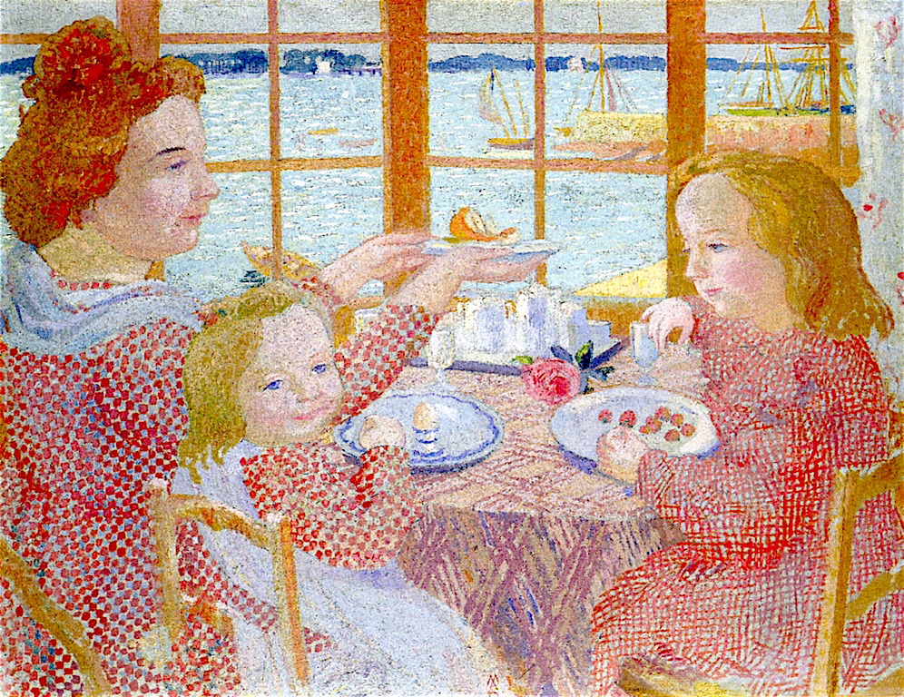 여기 단란한 가정의 아침식사 시간을 묘사한 그림이 있다. 엄마와 딸 아이 둘이 식탁에 앉아 아침을 먹고 있다. 전면의 창으로는 아침햇살이 환히 비치고, 바닷가 만의 푸른 물결 반사빛이 아이들 웃음소리처럼 반짝거린다. 엄마는 큰 딸에게 음식 접시를 건네고 있고, 언니는 동생을 사랑스럽게 바라보고, 다시 동생은 고개를 돌려 그림을 그리는 화가를 쳐다보고 있다. 이들 모녀는 모두들 화사한 붉은 무늬의 옷을 입고 있다.