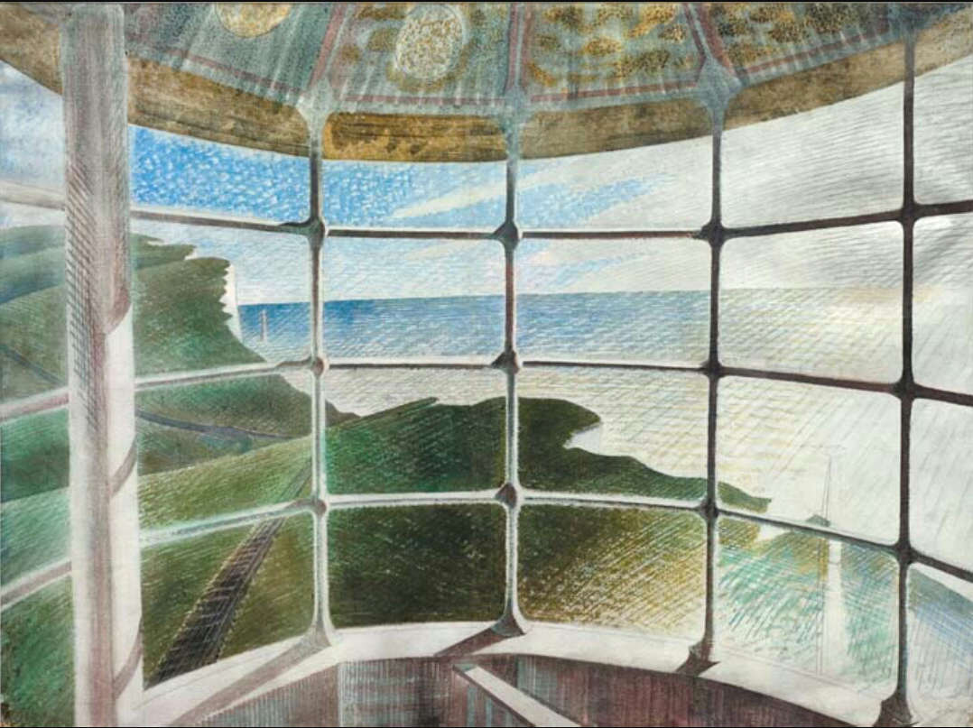보통 등대 그림은 바깥에서 그 외양을 그리는 경우가 대부분이다. 이 그림을 그린 에릭 라빌리우스(Eric Ravilious : 1903-1942) 역시도 별도로 바깥에서 그린 등대 그림이 따로 있다. 하지만 이처럼 등대 안에서 등대를 그린 그림은 극히 예외적이다. 이 등대는 영국 런던 남부 이스트 에섹스의 비치헤드에 있는 등대이다. 1832년에 지어졌으나 해안절벽 위에 위치한 관계로 항상 안개에 뒤덮혀 있어 가시거리가 짧다는 단점과 함께 절벽의 침식 우려로 1902년에 폐쇄되었다. 제2차 세계대전 과정에서 거의 붕괴되다시피 하였다가 다시 복원되어 현재는 관광숙박시설로 이용되고 있다.