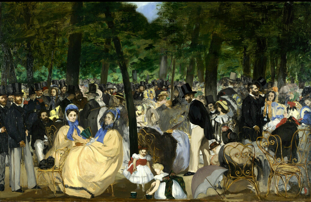 튈르리 정원은 파리 루브르 근처 공원으로 당시 매주 야외음악회가 열렸다. 그림 오른쪽 하단의 철제 의자가 보이는데, 그때까지 나무의자였던 것을 1862년에 바꾼 것이다. 이후 의자가 또 바뀌었을지도 모르지만 이들 두 예술가는 미술과 음악에서 각각 자기 자리를 굳건히 지키고 있다.