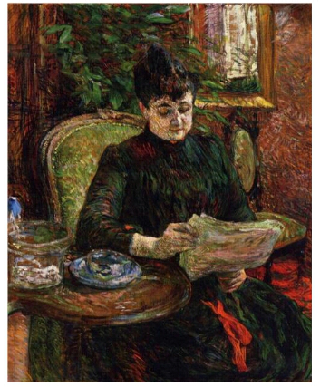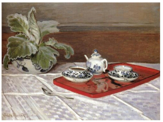 툴루즈 로트렉은 인물화의 배경 요소로 찻잔을 활용하고 있다. 그림 속의 여인은 차를 마시며 신문을 읽고 있다. 하지만 카셋의 그림과 제목 작명 형식만 다를 뿐 큰 차이는 없다. 모네의 경우도 정물로서 찻잔을 정갈하게 그린 그림 한 점이 있다.