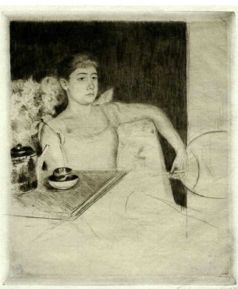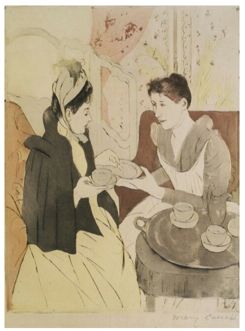 1880년대에 카셋은 일본 판화의 영향을 받아 수채화 같은 효과를 내는 부식 동판화 기법인 애쿼틴트를 통한 실험을 하였다. 10개의 칼러 프린트 시리즈 가운데, 차를 소재로 한 것도 있는데, 바로 <오후의 차 모임>이다. 이 그림은 한 젊은 여인이 손님에게 차와 케이크를 대접하는 장면을 그린 것이다. 하지만 화면 속의 여인들은 그렇게 친숙한 사이는 아닌 듯하다. 내방을 한 왼쪽 여인은 실내에서도 여전히 모자를 쓰고 있고 외투도 걸친 채로 앉아 있는 것으로 보아, 오래 이야기를 나눌 마음도 없는 어떤 예의상의 방문 자리인 것 같다. 집주인이 권하는 케이크도 마지 못해서 살짝 손만 짧게 내밀어 집어 들고 있다.