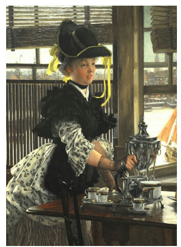 티소의 <차>는 후경으로 강이 보이는 건물의 실내에서 차를 따라 옮기려는 여인의 모습을 담고 있다. 이 그림은 티소가 영국에 가 있을 때 그린 것이다. 그런데 이 그림은 곧 배가 떠나는 선장과 이를 안타까워 하며 선장의 목을 껴안고 있는 그의 여자친구에게 차를 대접하는 장면을 그린 또다른 그림인 <안좋은 소식>에서의 한 쪽 부분을 그대로 재현하고 있는 그림이다. 스토리가 있는 그림의 일부분을 잘라낸 셈이다.