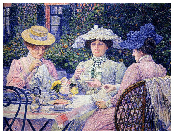이처럼 차를 마시는 공간이 실내인 것만도 아니며, 차를 마시며 꼭 담소만을 나누는 것도 아니다. 모여서 차를 마시면서도 각자 자신이 해야 하거나 하고 싶은 일이 있으면 동시에 같이 했다. 벨기에의 신인상주의 화가인 테오 반 뤼셀베르그의 또다른 그림 <정원에서의 여름날 오후의 차>를 보면, 세 여인이 각자 차를 마시기도 하고 손수건에 수를 놓거나 책을 읽고 있다.