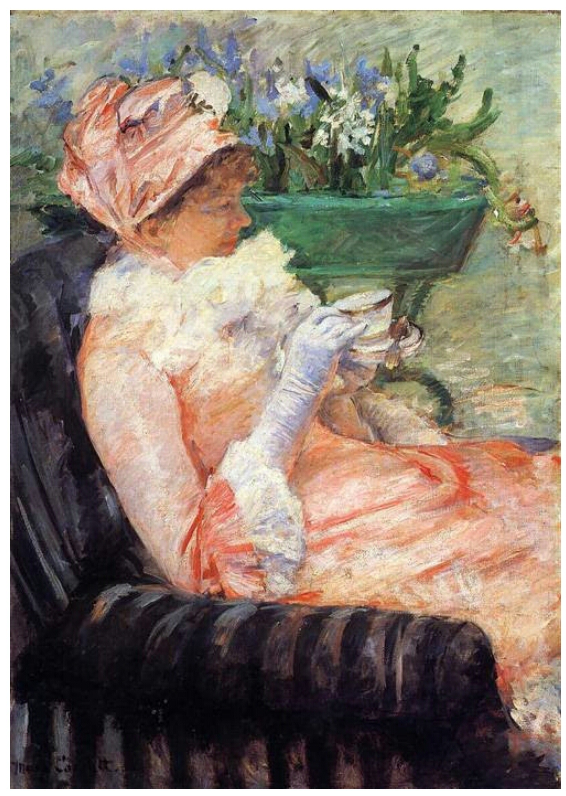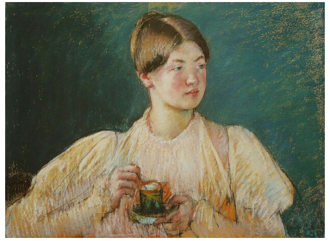 카셋이 차를 소재로 하여 그린 그림들은 이처럼 대부분 혼자이거나 두 명 정도의 인물이 등장한다. <티테이블의 여인>에서처럼 비록 찻잔이 여러 개 준비되어 있어도 그림의 인물은 혼자이다. 파스텔로 부드럽게 그린 <차 한 잔>(1897) 역시도 마찬가지이다. 젊은 여인이 차를 마시는 데 여전히 혼자이다. 마치 개인 초상화 같다고나 할까. 하지만 이들 초상화는 일부 초상 화가들이 요새로 치면 포샵 처리를 해 주듯이 미화하여 그리는 것과는 달리, <티테이블의 여인>에서처럼 그림의 주인쪽에서 수령을 거부할 정도로 사실 그대로 엄정히 표현하는 것이었다.