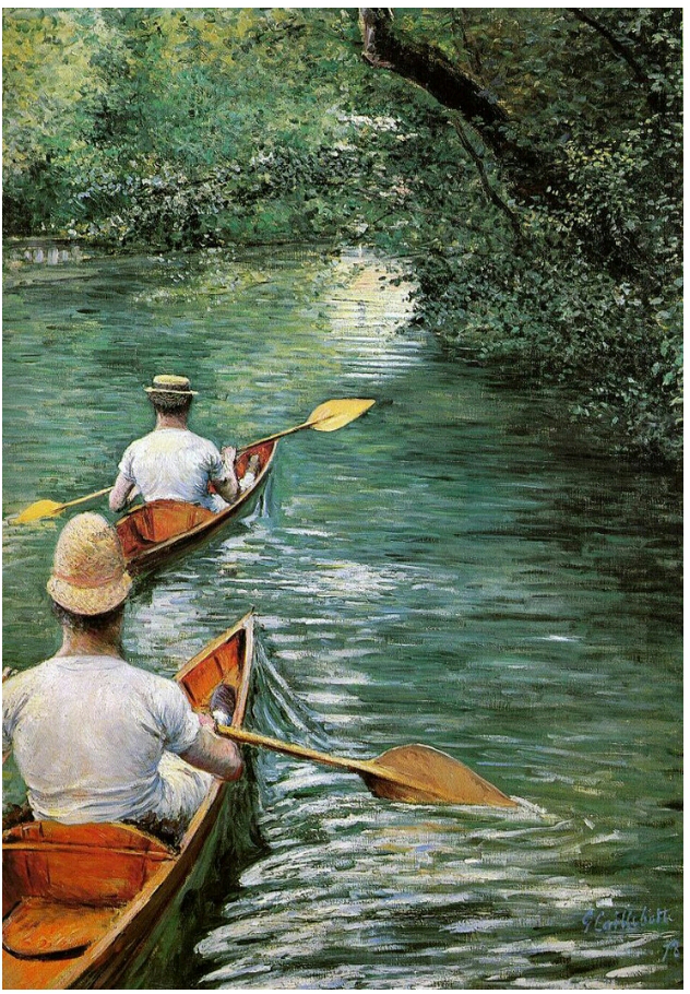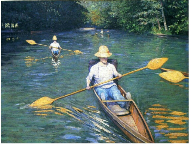 <소형배>의 경우는 반대로 배가 물살을 가르며 다가오는 형태로 구도를 잡았다. 하지만 시점은 마찬가지로 낮게 깔려 있어 관람객은 강의 한 가운데에서 수면과 맞닿아 뒤로 진행하고 있는 듯한 착각을 준다. <예르 강의 노젓는 사람들>은 아예 배경은 무시하고 노를 젓는 배 안을 보다 클로즈업시키고 있다. 전경의 인물은 그림 밖으로 곧 튀어 나올 듯하다. 이러한 시점은 강의 바깥에서 배를 바라보는 구경꾼의 시각이 아니라 배를 같이 타고서 경주에 참여하고 있는 참가자의 시각에서만이 가능한 시야를 보여준다. 수상 스포츠를 직접 즐겼던 카유보트만이 보여줄 수 있는 조망이다.