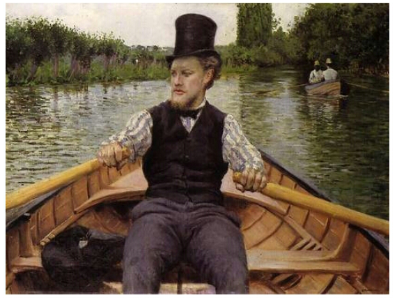 그럼에도 카유보트의 보트 그림들이 공통적으로 갖는 한 가지 특성은 그것이 남성들을 소재로 힘이나 역동성을 강조하고 있다는 점이다. <예르 강의 노젓는 사람들>이나 <탑햇을 쓰고 노젓는 사람>을 보면, 남성 인물들이 노를 저으며 팔을 뻗고 당기는 각도며, 힘을 주는 데 따라 불끈거리며 쏟구치거나 들어가는 팔의 근육, 손가락을 쥔 모습에서 드러나는 손의 악력 들이 생생이 느껴질 정도로 잘 묘사되어 있다. 보트에서 강렬한 햇빛을 막기 위해 대개는 가볍고 간편한 밀짚모자를 많이 쓰는데, 남성의 상징이라고 할 수 있는 탑햇을 쓰고서 노를 젓고 있는 모습은 다소 의아하게 비쳐질 수도 있겠다. 짐작컨대 예정에 없는 뱃놀이임에도 불구하고 갑자기 배를 타고 싶다는 여성의 간청을 기꺼이 받아준 남성의 포용력 넓은 신사도와 강인함을 과시하는 듯이 보인다.
