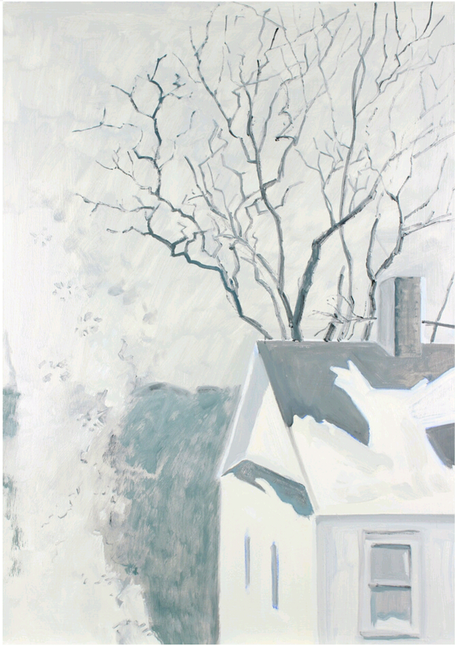 루이 도드, <지붕, 나무, 창 성에 +눈>, 2015, 마소나이트 판넬에 유채, 50.8×35.5cm, 뉴욕 알렉산드르 갤러리