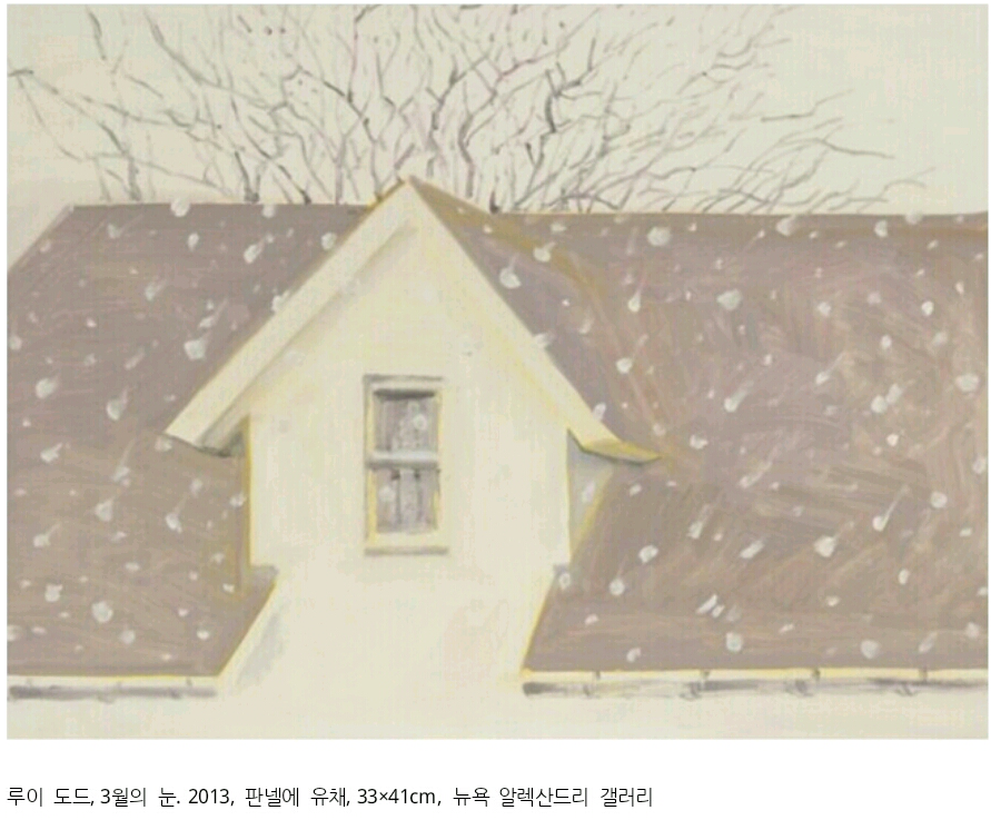 루이 도드(Lois Dodd: 1927~)의 <3월의 눈>이 그러하다. 지붕 위로 밤송이같은 눈송이가 말 그대로 펄펄 내리고 있다. 막 내리기 시작한 눈은 아직 쌓이지도 않았지만 엷은 회색톤의 화면 색조는 단번에 이 그림이 설경을 그린 것임을 알아차리게 만든다. 그림의 담백한 멋이 마치 동양화를 보고 있는 듯하다. 화면 전체를 차지하고 있는 지붕 위로 나뭇가지들이 방사형의 모습으로 하늘을 향해 치올라가고 있다. 어느 비평가가 이 그림을 설명하면서 앙상한 나뭇가지와 흩날리는 눈송이의 이중주를 발레에서 두 사람이 추는 춤인 파드되(pas de deux)에 비유하고 있는데, 나름 핵심을 포착하고 있는 묘사라 생각된다.