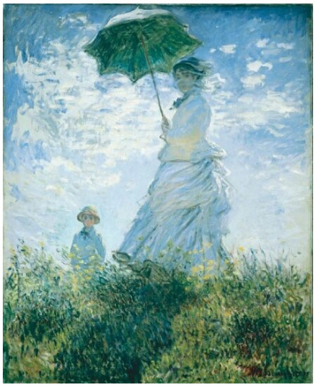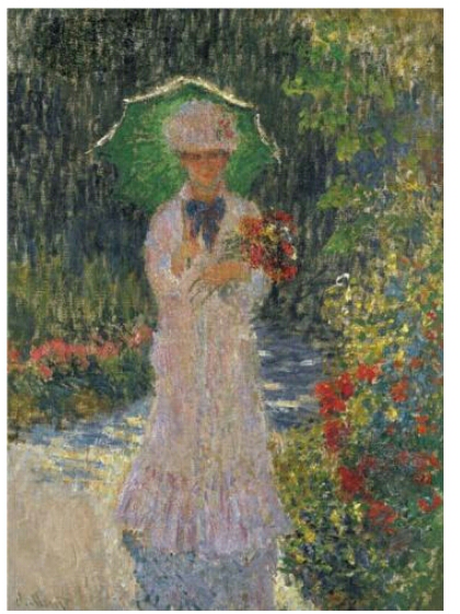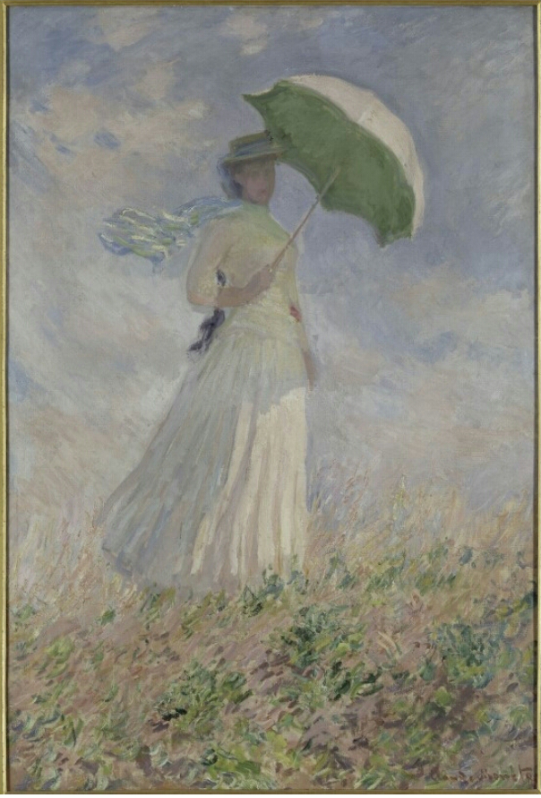 1875년작의 여인은 카미유이다. 하지만 1886년작의 여인은 수잔을 그렸지만 수잔이 아니다. 모네의 친구이기도 한 소설가이자 평론가인 옥타브 미르보가 묘사한 대로, 그녀는 허공 속에서 나타난 환영처럼 보인다. 모네에게 이 환영은 11년 전에 그 모습으로 화가 앞에 서있던 카미유의 환영일 것이다. 카미유의 환영은 따사로운 햇살 아래 황금빛 그림자로 영원처럼 서있다. 녹색 양산을 쓰고서 바람 흩날리는 언덕 위에서