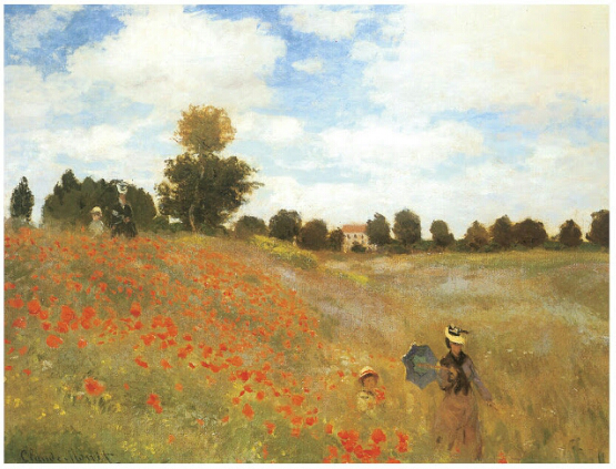 1878년까지 살았던 아르장퇴유 시절은 모네에게 충만한 시기이다. 폴 뒤랑-뤼엘의 지원을 받으면서 그는 집 근처에서 외광회화의 잠재력을 탐색할 수 있는 밝은 풍경들을 찾았다.그는 1874년 제1회 인상주의 전시회에서 <양귀비 들판>을 전시하였다. 양귀비 꽃이 만발한 여름 들판을 어머니와 아이가 거닐고 있다. 이들은 전경과 뒷배경에 각각 한 쌍씩 있다. 여인은 햇살이 그렇게 세지 않은 듯 양산을 옆구리에 끼고서 아들과 함께 들판을 소요하고 있다. 들판은 아르장퇴유의 젠느빌리에 들판이고, 여인과 아이는 아내 카미유와 아들 장을 모델로 한 듯하다. 하지만 인물들은 겨우 식별만 가능할 뿐 그림의 진정한 주관심사는 자연의 풍경이다.