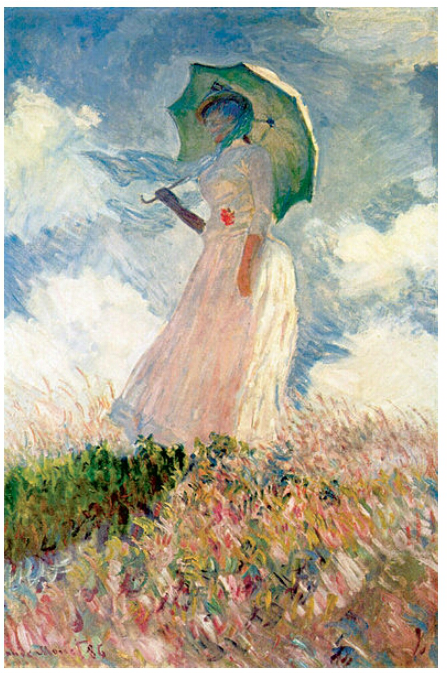 1886년작 <양산을 쓴 여인>은 앞서 1875년작 <양산을 쓴 여인: 모네 부인과 아들>의 데자뷰를 보는 듯하다. 하지만 모델은 모네의 두 번째 부인인 알리스의 딸 수잔이다. 이 그림은 지베르니의 야외에서 그린 것이다. 배경은 엡트 강이 센 강으로 흘러 들어가는 오르티에라는 작은 섬이다.