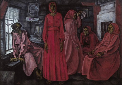 어두운 실내를 배경으로 다섯 명의 나이든 여인들이 앉거나 서 있다. 그들은 머리에 수건을 쓴 채 모두 어두운 계열의 붉은 색조 옷을 입고 있다. 얼굴 표정들 또한 한결같이 어둡다. 한 여인이 창가 의자에 앉아 몸을 돌려 창밖을 보고 있지만 명암 효과로 인해 옷색깔만 조금 밝게 표현되었을 뿐 얼굴빛은 여전히 어둠에 싸여 있다. 무슨 일인가.