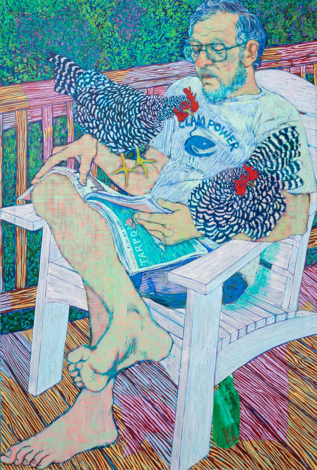 책을 읽는 것은 대개 개별적인 개인 행위이다. 물론 예외적으로 아이에게 책을 읽어 주거나 낭독회에서처럼 여럿이 같이 하는 경우도 있을 수 있다. 그런데 그림에서처럼 책을 읽는 데 동참하는 주체가 동물이 될 수도 있나 보다. 초로의 남자가 발코니 의자에 앉아 책을 보는데 닭 두 마리가 양팔에 앉아 독서 자리를 함께 하고 있다. 그림 제목으로 보아 이 닭들은 이름도 가진 반려동물이다. 반려계인 셈이다.