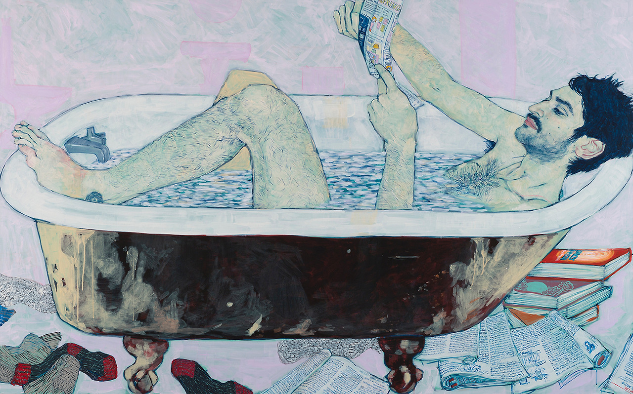 느긋하게 욕조에 누워 읽을거리를 들여다 보고 있다. 비록 욕조가 좁아 발을 다 뻗을 수 없어 무릎을 구부린 자세이지만 표정만은 여유만만이다. 자주 이렇게 이용하는지 욕실에는 양말이나 옷가지 이외에도 다른 책자들이 쌓여 있고 잡지들도 나뒹굴고 있다. 심신이 이렇게 편안할 수 있다면 천국이 따로 없을 것이다.
