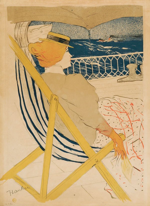 우아한 모습의 이 여자 승객은 갑판의자에 앉아 책을 읽다가 먼 바다를 보며 몽상에 빠져 있었다. 작은 끈이 달린 모자를 이마 위로 약간 기울여 쓴 이 금발의 여인을 보자 툴루즈 로트렉은 바로 매료되었다. 여인은 프랑스 식민지 관료의 아내로 남편을 만나러 아프리카 세네갈로 가는 길이었다. 툴루즈 로트렉이 이 여인에게 마음을 주고 어떻게 해 보려 했는지 구체적인 내용은 딱히 알 수 없다. 다만 분명한 것은 로트렉이 이 여승객과 같이 있기 위하여 일정을 바꾸어서 예정에 없던 포르투갈 리스본까지 여정을 늘였다는 사실이다. 동행했던 기베르는 어처구니가 없어 일정 변경을 반대하고 비난하였지만 로트렉은 막무가내였다.