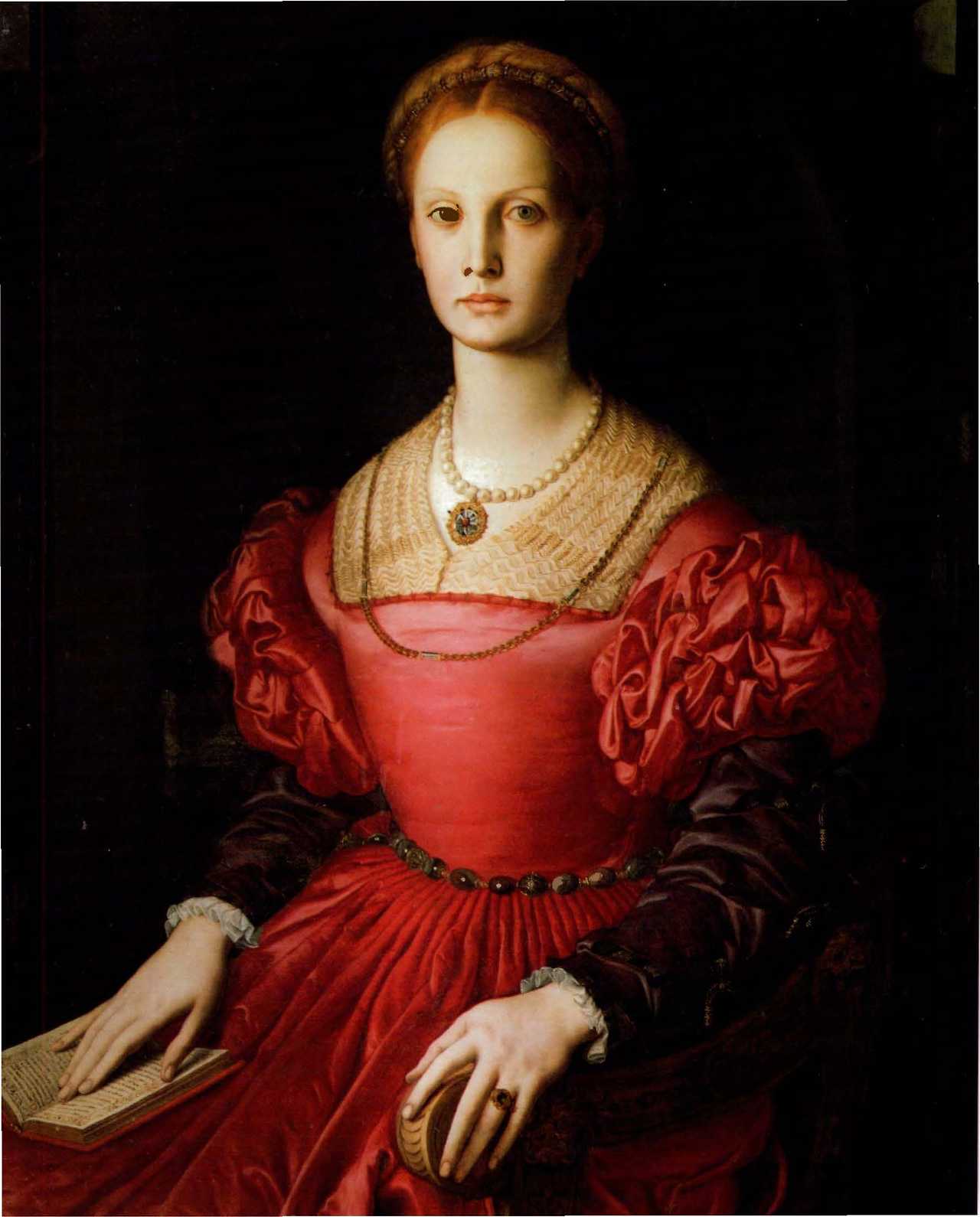 아뇰로 브론치노(Agnolo Bronzino : 1503-1572)는 피렌체 태생의 이탈리아 화가이다. 30대 후반부터 피렌체의 대공인 코지모 데 메디치의 궁정 화가로서 왕성하게 작품활동을 하였다. 초상화를 많이 그렸으며, 종교적이거나 우화적인 주제의 그림도 많다. 메디치 가의 초상화는 그가 직접 참여한 복사본도 많은데, 이는 외교적 선물로 활용되었다. 그는 매너리즘(Mannerism)의 대표 화가중 하나로 인정받는다. 매너리즘은 미술사 시대 구분에서 르네상스 미술에서 바로크 미술로 넘어가기 전에 나타났던 과도기적인 미술 양식을 말한다. 그 특징으로는 왜곡되고 늘어진 형상, 불명료한 구도, 양식적인 속임수와 기괴한 효과 등을 들 수 있다. 이 초상화에서도 목이나 손가락의 길이가 실제보다 과장되어 묘사되고 있음을 볼 수 있다. 이처럼 인체를 극도로 길게 늘이는 과장된 표현은 열광적 감정, 긴장과 부조화의 느낌, 신경 불안의 감각을 전달한다.