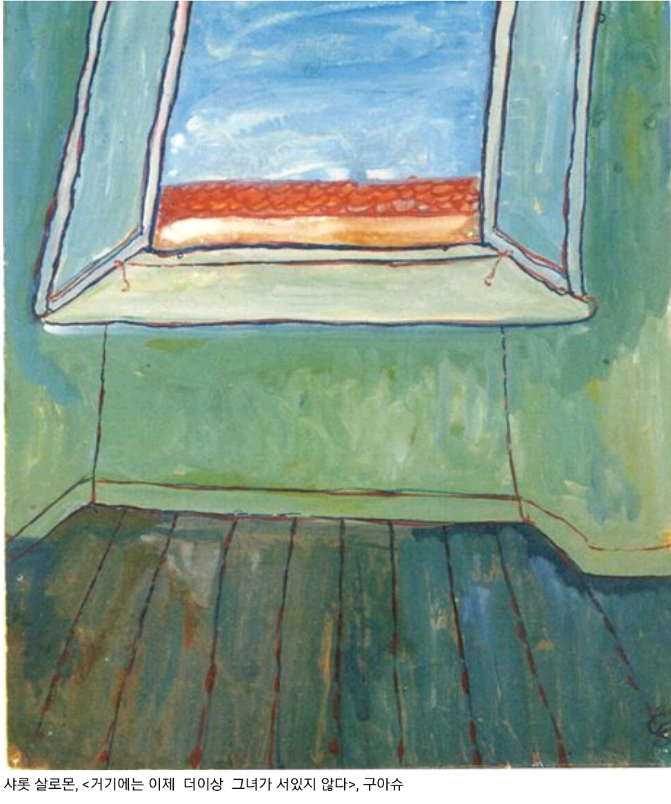 창 앞에 설 때 우리는 어디만큼 와 있게 되는 것인가. 적어도 샤롯 살로몬의 경우는 창 앞에 서 있었을 때 그녀 생의 한가운데를 관통하고 있었다. 나치의 조여오는 압박을 본능적으로 감지했을까. 그녀는 창과 함께 인물이 그려진 여러 그림들 이외에 이렇게 자신의 모습이 지워진 빈 창의 그림도 아울러 남겼다. 하지만 이때쯤 그녀는 과거의 창틀에 갖혀 있지 않았던 듯하다. 창틀의 상단 부분을 그리지 않고 열어 놓음으로써 시각적으로 트인 개방감을 확보하고 있으며, 심리적으로도 불투명한 앞날을 적극적으로 헤쳐 나가겠다는 의지가 엿보인다.