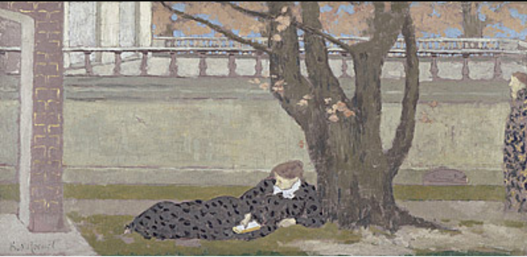 때는 가을이다. 천고마비의 계절엔 책읽기가 제격이다. 한 여인이 나무 아래서 비스듬히 누워 책을 읽고 있다. 케르 자비에 루셀(Ker-Xavier Roussel: 1867 – 1944 )은 프랑스 인상주의 화가이다. 이와 비슷한 분위기의 작품이 두 점 더 있다. 하나는 <여인들의 만남>이고, 다른 하나는 <테라스에서의 대화>이다. 이들 작품에는 테라스와 가을 나뭇잎, 점박 무늬 패턴의 옷을 입은 여인 등이 모두 같이 등장한다. 하지만 이 작품 <테라스>에는 고립의 분위기가 느껴진다. 다른 두 작품에서는 여인들이 서로 어울려 이야기하면서 서로 교류하는 상호작용을 하는 모습이 있지만 여기에서는 같이 등장하는 다른 여인과 서로 무심한 채 아무런 반응도 나누지 않는다. 가을엔 홀로 고독하게 있으라는 뜻인가.