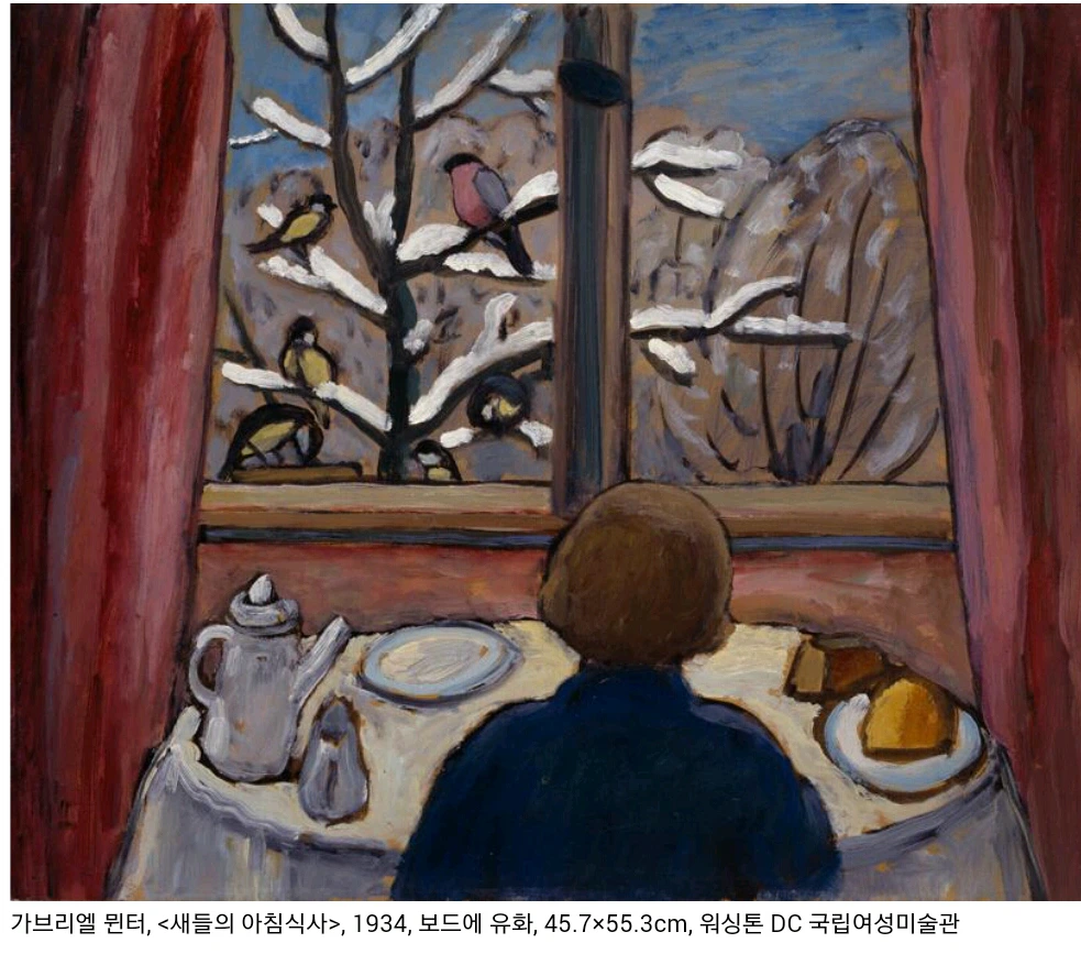 뮌터의 예술은 칸딘스키의 영향을 많이 받았다. 나중에 그녀는 칸딘스키가 자신의 재능을 축복하고 이해했으며 보호하고 더 진전시켰다고 말했다. 뮌터가 <새들의 아침식사>를 그렸을 때는 50대 후반이다. 아마도 희미한 옛사랑의 그림자를 더듬고 있었는지도 모르겠다. 반면에 39세에 그린 또다른 그림 <숙고>는 앞의 그림과는 사뭇 대조적이다. 표현주의적인 스타일은 두 그림이 비슷하다. 두텁고 빠른 붓질, 무겁고 어두운 윤곽선, 간결한 형태와 압축된 공간 등은 모두 공통되다. 하지만 전면에 앞모습으로 실내에 앉아 있는 지적이고 당찬 모습의 인물 얼굴을 보라. 사랑을 받으며 같이 할 때의 모습과 버림을 받고 혼자 남겨질 때의 모습은 이렇게도 차이가 난다. 한쪽은 아예 얼굴조차 드러나지 않는 데 반해, 다른 한쪽은 얼굴에 초점이 맞추어지면서 창을 등지고 있는 어두운 배경 속에서도 환히 빛난다.