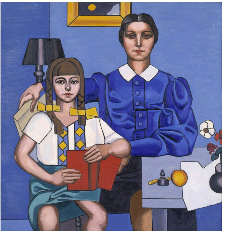 마치 하나의 증명사진을 보는 듯하다. 예전 사진이 없었을 때 그렸던 초상화를 대면하고 있는 것 같다. 두 모녀임이 틀림없을 여인과 소녀가 책상을 비켜 앉아 정면을 응시한 채 카메라를 쳐다보듯 긴장한 자세를 취하고 있다. 파란 원색의 통일감 속에서도 소녀의 노란색 리본과 두 손으로 들고 있는 붉은 색 책이 강조되어 눈에 띤다. 엄마도 소녀를 안 듯이 의자에 팔을 휘감아 걸치고 있는 손에 책을 들고 있다. 어지간히 책을 좋아하는 모녀인가 보다. 그리고 이를 증명하듯이 이 증명사진같은 그림을 남겼다.