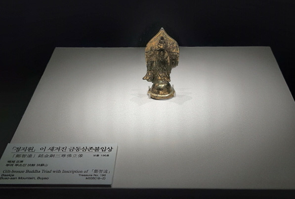 이전에 올린 낙화암 관련 글에서 소개한 불상이다. 부소산성을 오르며 들른 '반월루'라는 정자 근처에서 발굴되었다는 유물을 여기서 직접 볼 수 있었다. 마치 단서를 따라 보물을 찾은 것처럼 반가웠다. 정지원이라는 사람이 아내의 명복을 빌며 만든 불상이며 크기는 8.5cm로 생각보다 작았다. 비록 왼쪽 보살상은 거의 사라졌지만 광배 뒷면에 새겨진 문자는 남아있다. 불상의 주인은 아마 자신의 이름이 이토록 오랫동안 남아 박물관에 걸리게 될 거라는 예상은 하지 못했을 것 같다.
