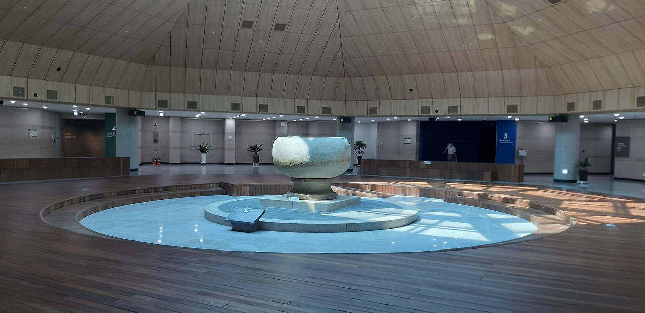 박물관에 들어서자 덩그러니 놓여 있는 돌그릇이 독특했다. '부여 석조'라고 불리는 이 유물은 백제 왕궁이 있던 관북리 일대에서 발견되었으며 연꽃을 심어두었던 그릇이라 추정되고 있다. 석조를 가운데 두고 의자가 둥글게 놓여있고 각 전시실은 로비를 중심으로 문이 나 있어서 관람 중간에 앉아서 쉬고는 했다.